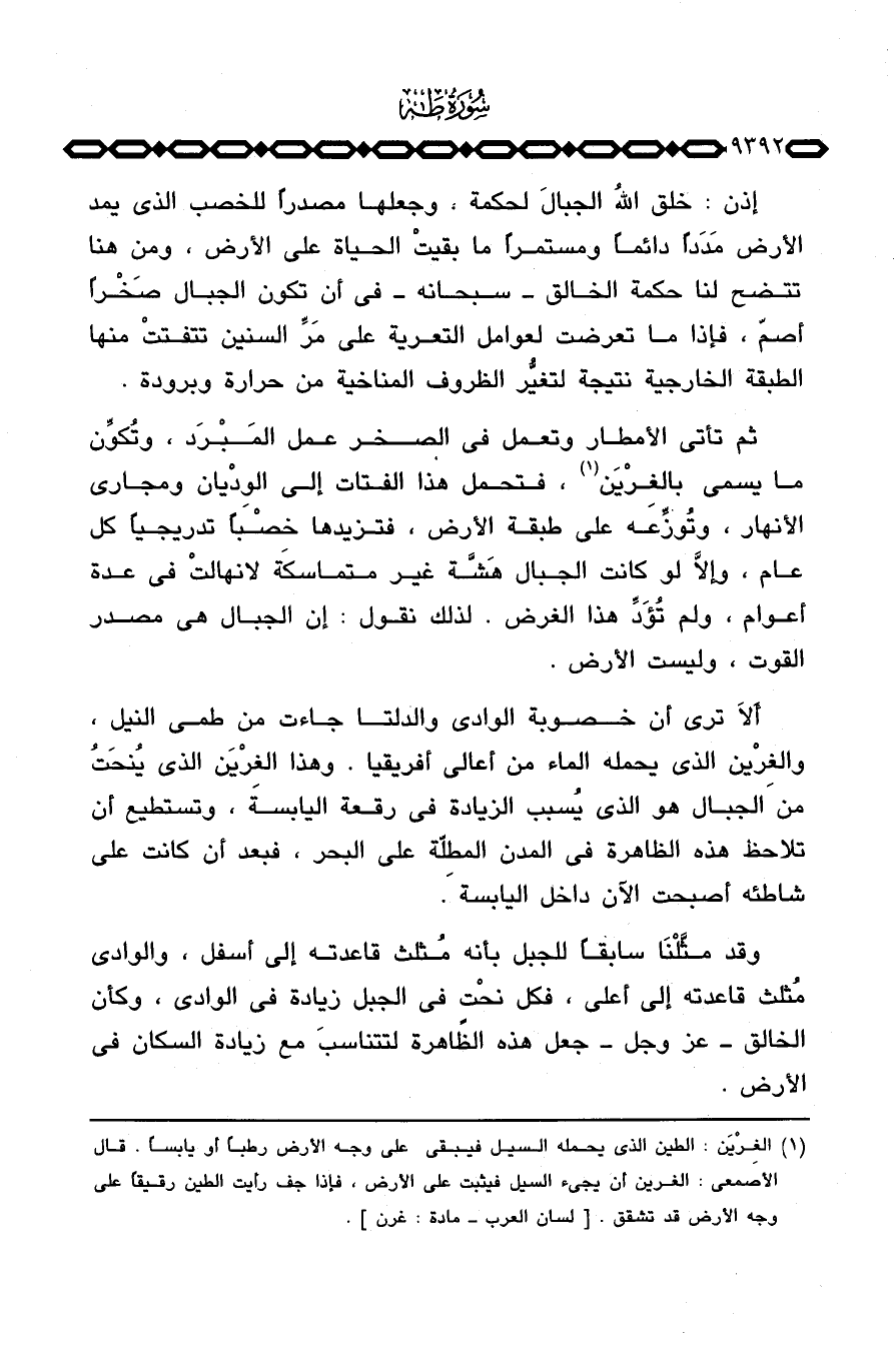 ألاَ ترى أن خصوبة الوادي والدلتا جاءت من طمي النيل، والغِرْين الذي يحمله الماء من أعالى أفريقيا. وهذا الغِرْيَن الذي يُنحَتُ من الجبال هو الذي يُسبب الزيادة في رقعة اليابسة، وتستطيع أن تلاحظ هذه الظاهرة في المدن المطِلَّة على البحر، فبعد أن كانت على شاطئه أصبحت الآن داخل الياسبة.