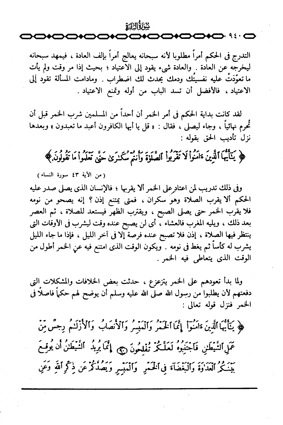 وفي ذلك تدريب لمَنْ اعتاد على الخمر ألا يقربها؛ فالإنسان الذي يصلي صدر عليه الحكم ألا يقرب الصلاة وهو سكران، فمتى يمتنع إذن؟ إنه يصحو من نومه فلا يقرب الخمر حتى يصلي الصبح، ويقترب الظهر فيستعد للصلاة، ثم العصر بعد ذلك، ويليه المغرب فالعشاء، أي لن يصبح عنده وقت ليشرب في الأوقات التي ينتظر فيها الصلاة، إذن فلا تصبح عنده فرصة إلا في آخر الليل، فإذا ما جاء الليل يشرب له كأساً ثم يغط في نومه. ويكون الوقت الذي امتنع فيه عن الخمر أطول من الوقت الذي يتعاطى فيه الخمر.