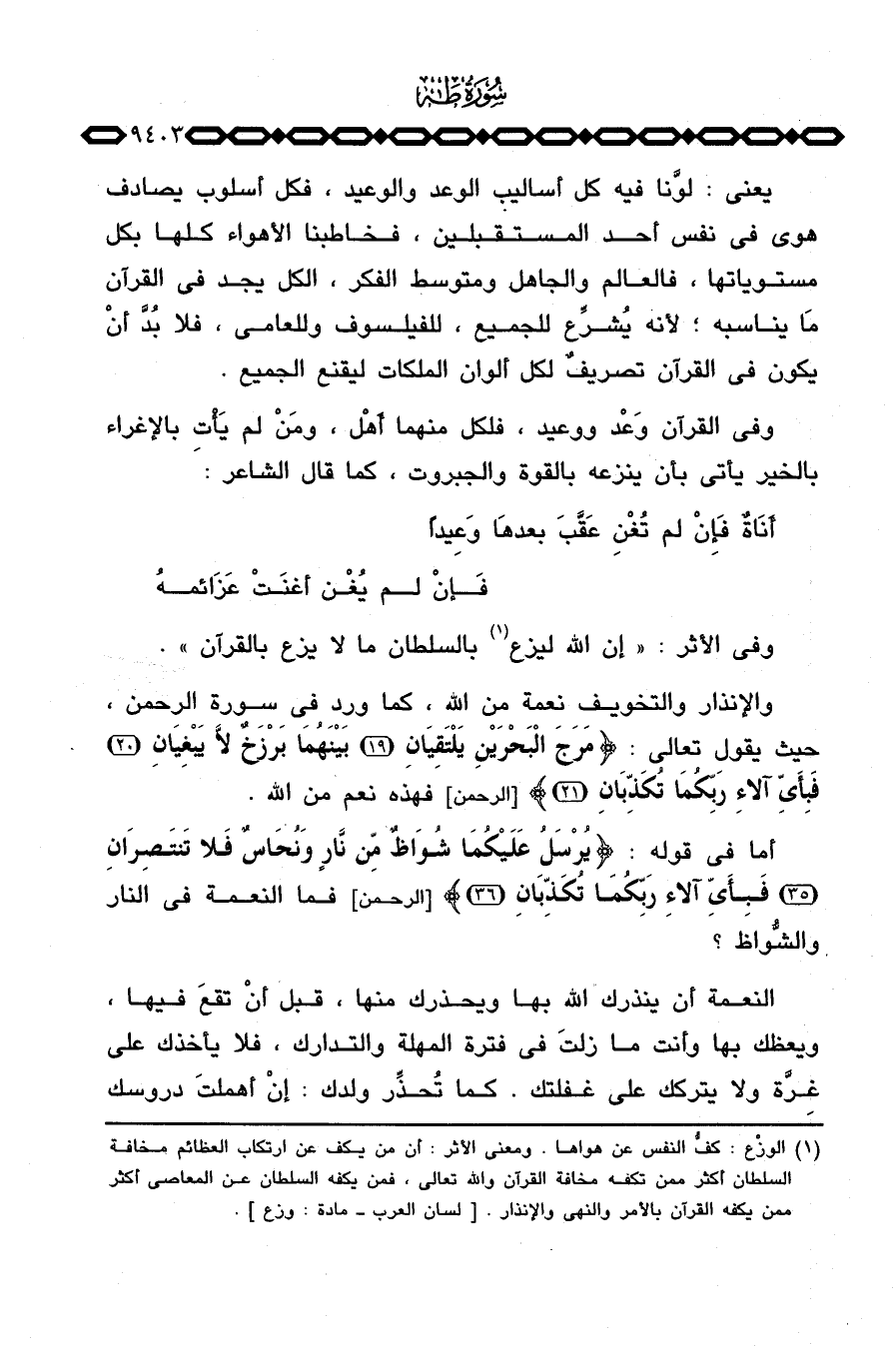 يعني: لوَّنا فيه كل أساليب الوعد والوعيد، فكل أسلوب يصادف هوى في نفس أحد المستقبلين، فخطابنا الأهواء كلها بكل مستوياتها، فالعالم والجاهل ومتوسط الفكر، الكل يجد في القرآن مَا يناسبه؛ لأنه يُشرِّع للجميع، للفيلسوف وللعامي، فلا بُدَّ أنْ يكون في القرآن تصريفٌ لكل ألوان الملكات ليقنع الجميع.