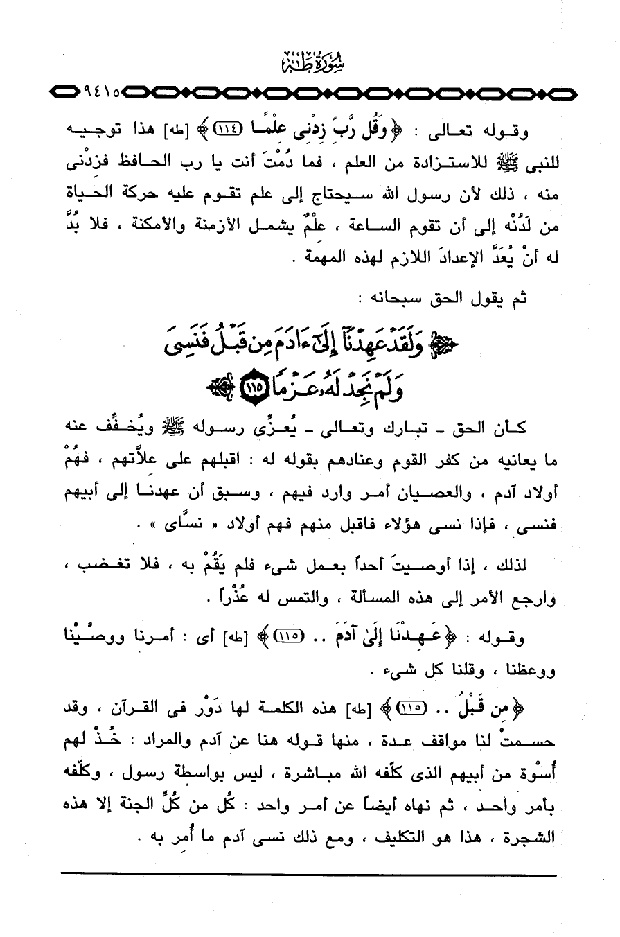 {مِن قَبْلُ} [طه: 115] هذه الكلمة لها دَوْر في القرآن، وقد حسمتْ لنا مواقف عدة، منها قوله هنا عن آدم والمراد: خُذْ لهم أُسْوة من أبيهم الذي كلّفه الله مباشرة، ليس بواسطة رسول الله، وكلّفه بأمر واحد، ثم نهاه أيضاً عن أمر واحد: كُل من كُلِّ الجنة إلا هذه بأمر واحد، ثم نهاه أيضاً عن أمر واحد: كُل من كُلِّ الجنة إلا هذه الشجرة، هذا هو التكليف، ومع ذلك نسى آدم ما أُمِر به.