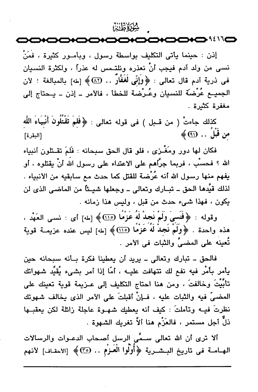 فالحق تبارك وتعالى يريد أن يعطينا فكرة بأنه سبحانه حين يأمر بأمْر فيه نفع لك تتهافت عليه، أمّا إذا أمر بشيء يُقيِّد شهواتك تأبَّيْتَ وخالفتَ، ومن هنا احتاج التكليف إلى عزيمة قوية تعينك على المضيّ فيه والثبات عليه، فإنْ أقبلتَ على الأمر الذي يخالف شهوتك نظرتَ فيه وتأملتَ: كيف أنه يعطيك شهوة عاجلة زائلة لكن يعقبها ذلٌّ آجل مستمر، فالعَزْم هنا ألاَّ تغريك الشهوة.