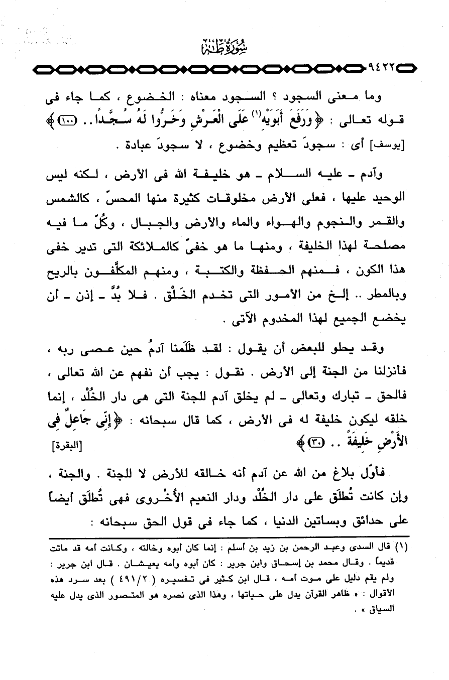 فأوّل بلاغ من الله عن آدم أنه خالقه للأرض لا للجنة. والجنة، وإن كانت تُطلَق على دار الخُلْد ودار النعيم الأُخْروي فهي تُطلَق أيضاً على حدائق وبساتين الدنيا، كما جاء في قول الحق سبحانه: