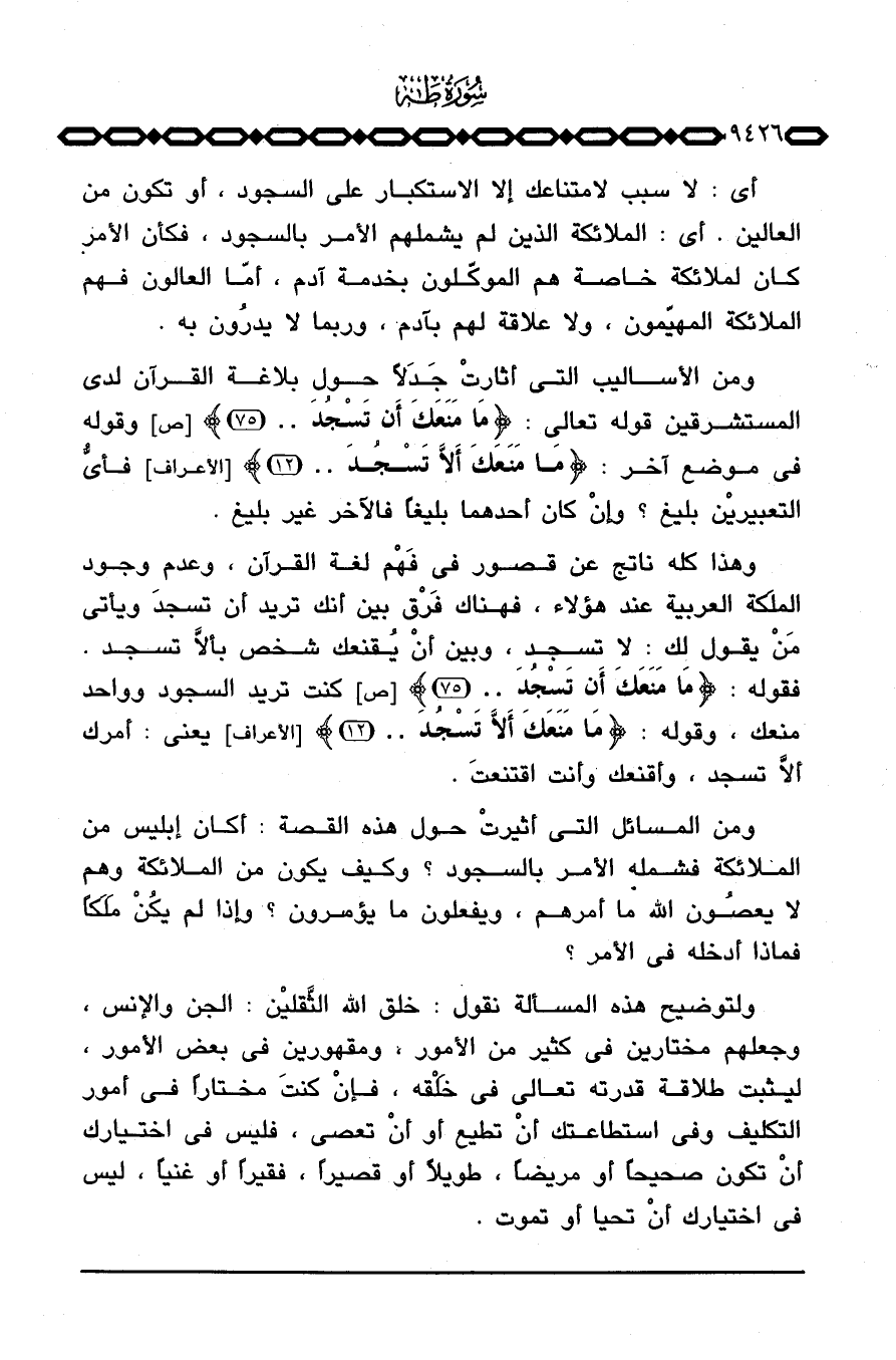 وهذا كله ناتج عن قصور في فَهْم لغة القرآن، وعدم وجود الملَكة العربية عند هؤلاء، فهناك فَرْق بين أنك تريد أن تسجدَ ويأتي مَنْ يقول لك: لا تسجد، وبين أنْ يُقنعك شخص بألاَّ تسجد. فقوله: {مَا مَنَعَكَ أَن تَسْجُدَ} [ص: 75] كنت تريد السجود وواحد منعك، وقوله: {مَا مَنَعَكَ أَلاَّ تَسْجُدَ} [الأعراف: 12] يعني: أمرك ألاَّ تسجد، وأقنعك وأنت اقتنعتَ.