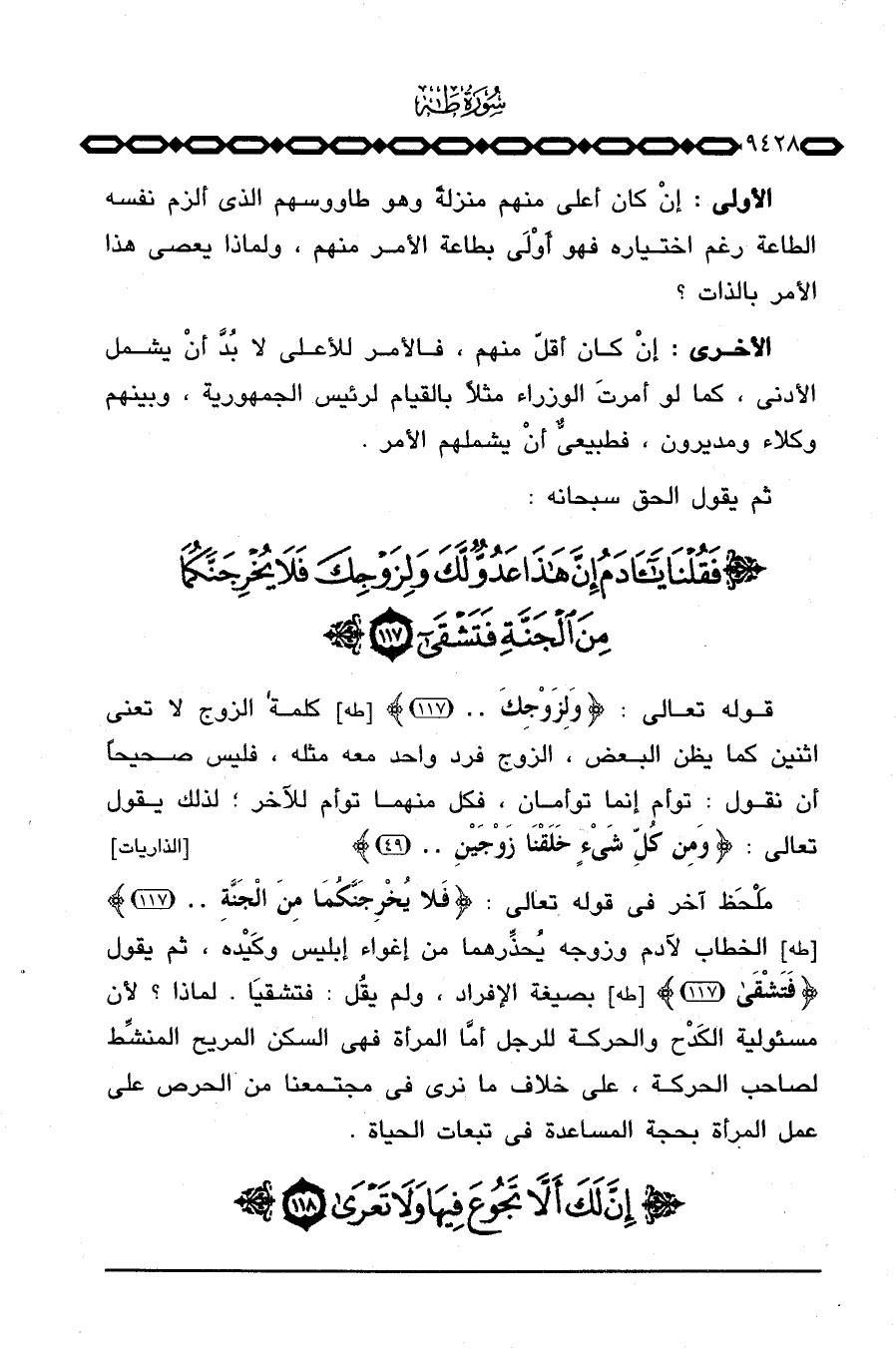 مَلْحَظ آخر في قوله تعالى: {فَلاَ يُخْرِجَنَّكُمَا مِنَ الجنة} [طه: 117] الخطاب لآدم وزوجه يُحذِّرهما من إغواء إبليس وكَيْده، ثم يقول {فتشقى} [طه: 117] بصيغة الإفراد، ولم يقُل: فتشقيَا. لماذا؟ لأن مسئولية الكَدْح والحركة للرجل أمَّا المرأة فهي السكن المريح المنشِّط لصاحب الحركة، على خلاف ما نرى في مجتمعنا من الحرص على عمل المرأة بحجة المساعدة في تبعات الحياة.