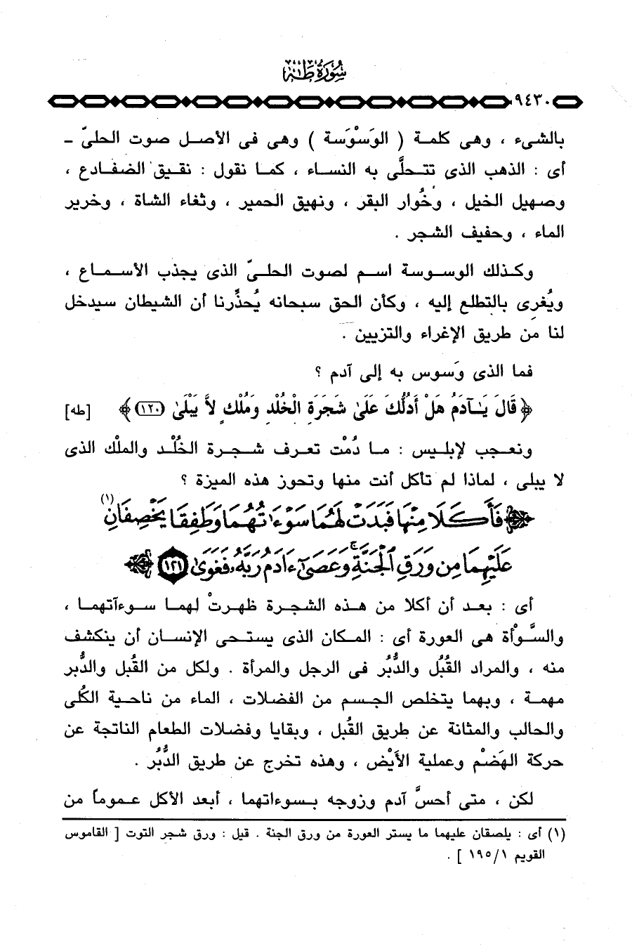 أي: بعد أن أكلا من هذه الشجرة ظهرتْ لهما سوءآتهما، والسَّوْأة هي العورة أي: المكان الذي يستحي الإنسان أن ينكشف منه، والمراد القُبُل والدُّبُر في الرجل والمرأة. ولكل من القُبل والدُّبر مهمة، وبهما يتخلص الجسم من الفضلات، الماء من ناحية الكُلى والحالب والمثانة عن طريق القُبل، وبقايا وفضلات الطعام الناتجة عن حركة الهَضْم وعملية الأَيْض، وهذه تخرج عن طريق الدُّبُر.