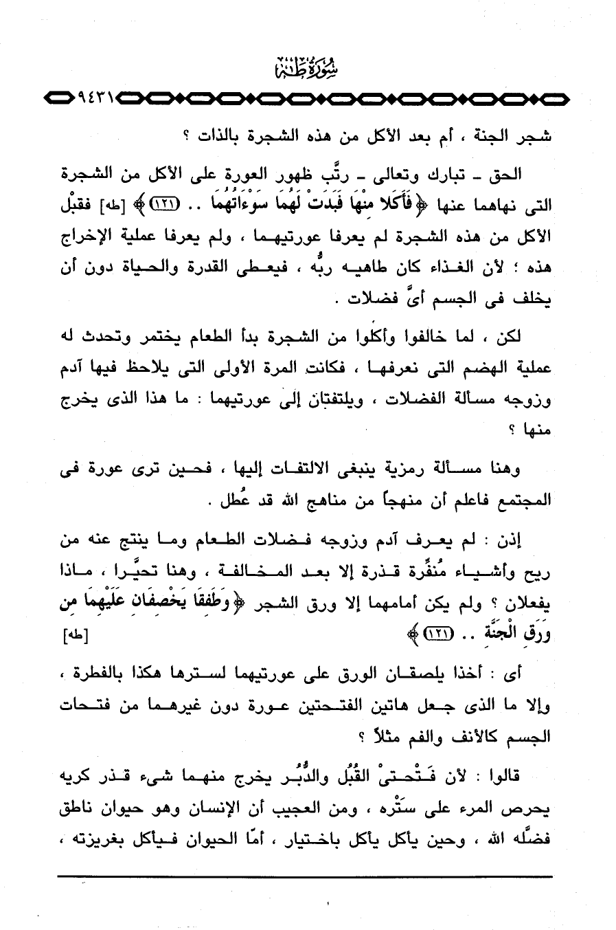 الحق تبارك وتعالى رتَّب ظهور العورة على الأكل من الشجرة التي نهاهما عنها {فَأَكَلاَ مِنْهَا فَبَدَتْ لَهُمَا سَوْءَاتُهُمَا} [طه: 121] فقبْل الأكل من هذه الشجرة لم يعرفا عورتيهما، ولم يعرفا عملية الإخراج هذه؛ لأن الغذاء كان طاهيه ربُّه، فيعطي القدرة والحياة دون أن يخلف في الجسم أيَّ فضلات.