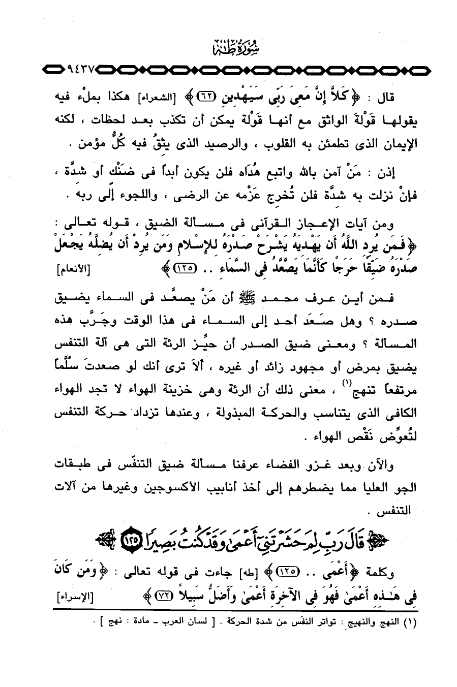 فمن أين عرف محمد صَلَّى اللَّهُ عَلَيْهِ وَسَلَّم َ أن مَنْ يصعِّد في السماء يضيق صدره؟ وهل صَعَد أحد إلى السماء في هذا الوقت وجَرَّب هذه المسألة؟ ومعنى ضيق الصدر أن حيِّز الرئة التي هي آلة التنفس يضيق بمرض أو مجهود زائد أو غيره، ألاَ ترى أنك لو صعدتَ سُلَّماً مرتفعاً تنهج، معنى ذلك أن الرئة وهي خزينة الهواء لا تجد الهواء الكافي الذي يتناسب والحركة المبذولة، وعندها تزداد حركة التنفس لتُعوِّض نَقْص الهواء.