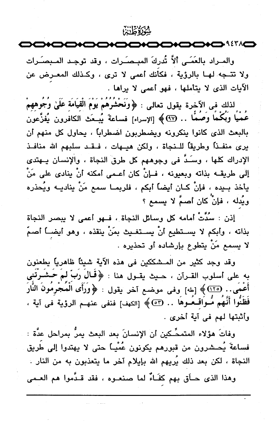 وقد وجد كثير من المشككين في هذه الآية شيئاً ظاهرياً يطعنون به على أسلوب القرآن، حيث يقول هنا: {قَالَ رَبِّ لِمَ حشرتني أعمى} [طه: 125] وفي موضع آخر يقول: {وَرَأَى المجرمون النار فظنوا أَنَّهُمْ مُّوَاقِعُوهَا} [الكهف: 53] فنفى عنهم الرؤية في آية، وأثبتها لهم في آية أخرى.