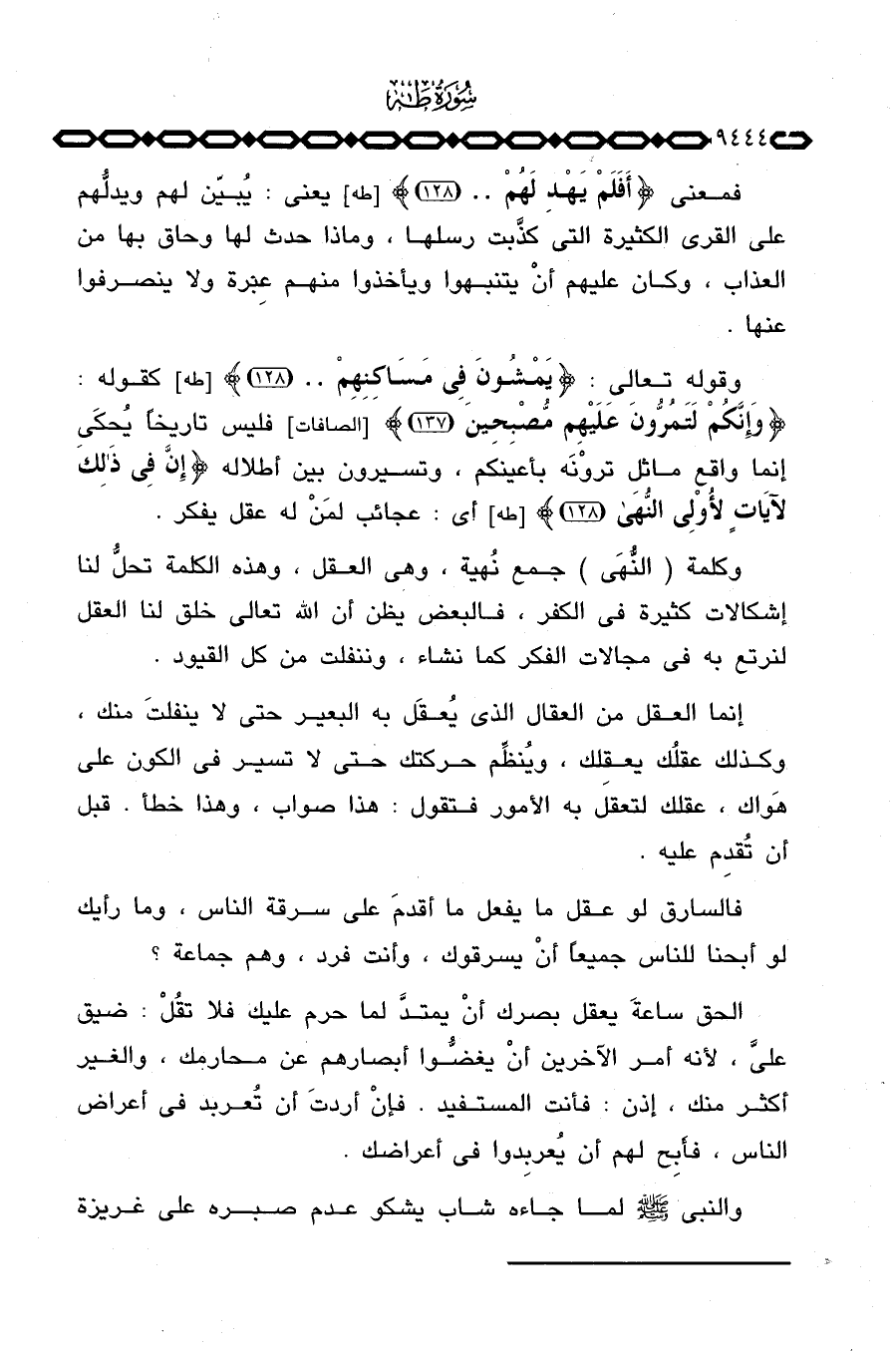 وكلمة (النُّهَى) جمع نُهية، وهي العقل، وهذه الكلمة تحلُّ لنا إشكالات كثيرة في الكفر، فالبعض يظن أن الله تعالى خلق لنا العقل لنرتع به في مجالات الفكر كما نشاء، وننفلت من كل القيود.