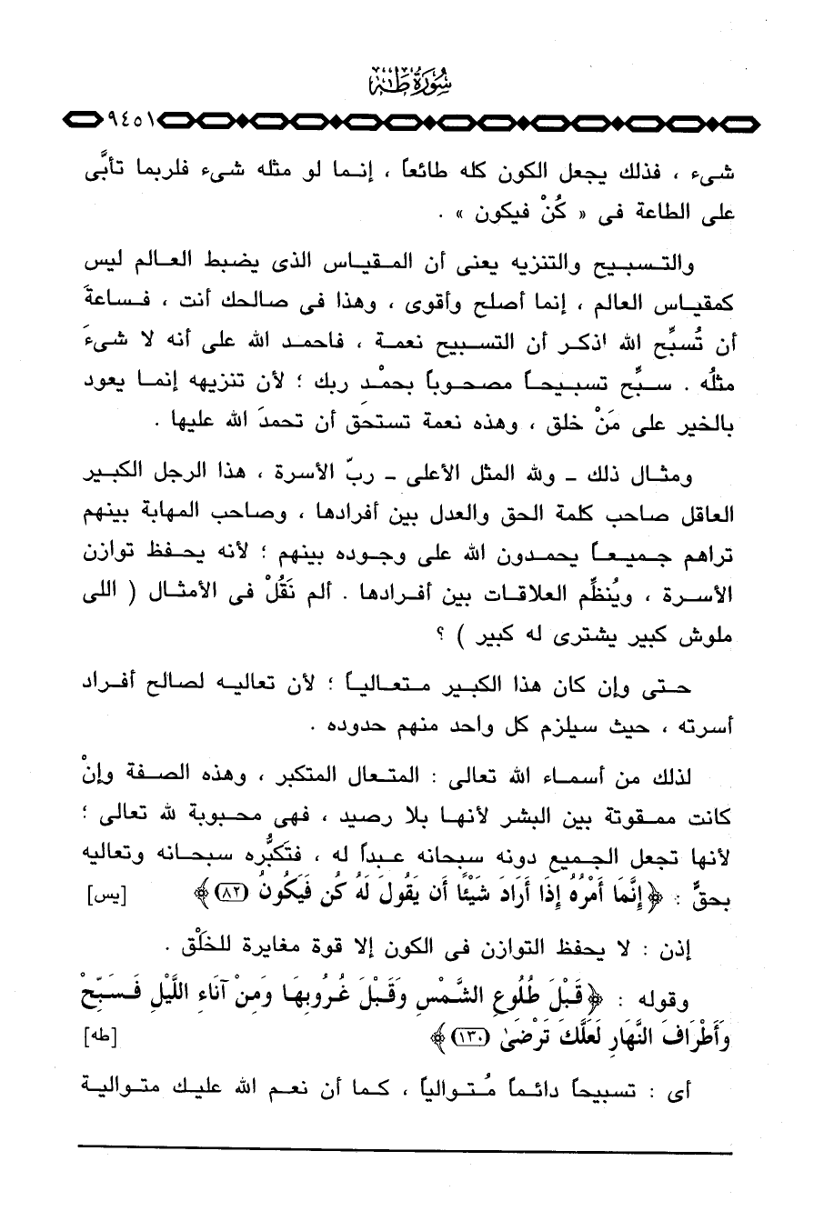 والتسبيح والتنزيه يعني المقياس الذي يضبط العالم ليس كمقياس العالم، إنما أصلح وأقوى، وهذا في صالح أنت، فساعةَ أن تُسبِّح الله اذكر أن التسبيح نعمة، فاحمد الله على أنه لا شيءَ مثلُه. سبِّح تسبيحاً مصحوباً بحمْدِ ربك؛ لأن تنزيهه إنما يعود بالخير على مَنْ خلق، وهذه نعمة تستحق أن تحمدَ الله عليها.
