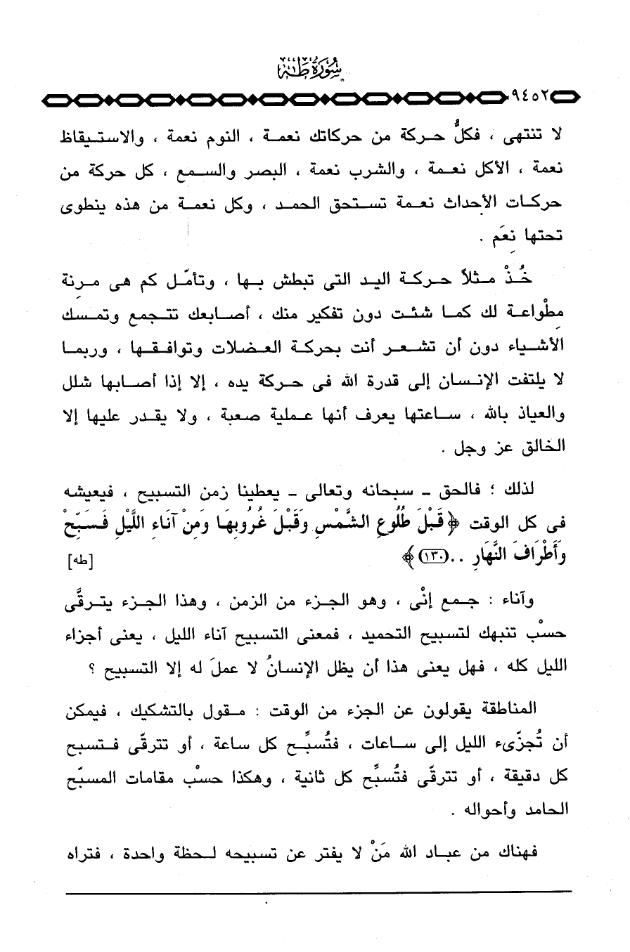 المناطقة يقولون عن الجزء من الوقت: مقول بالتشكيك، فيمكن أن تُجزّىء الليل إلى ساعات، فتُسبِّح كل ساعة، أو تترقّى فتسبح كل دقيقة، أو تترقّى فتُسبِّح كل ثانية، وهكذا حسْب مقامات المسبّح الحامد وأحواله.