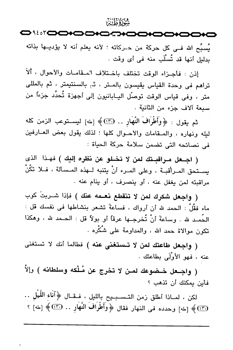 ثم يقول: {وَأَطْرَافَ النهار} [طه: 130] ليستوعب الزمن كله ليله ونهاره، والمقامات والأحوال كلها؛ لذلك يقول بعض العارفين في نصائحه التي تضمن سلامة حركة الحياة: