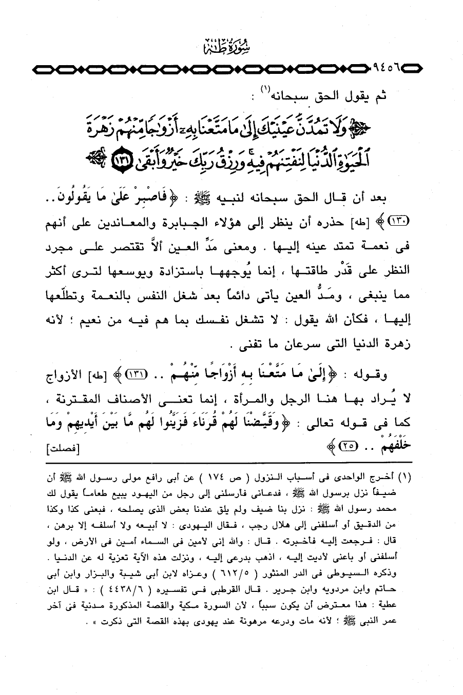 بعد أن قال الحق سبحانه لنبيه صَلَّى اللَّهُ عَلَيْهِ وَسَلَّم َ: {فاصبر على مَا يَقُولُونَ} [طه: 130] حذره أن ينظر إلى هؤلاء الجبابرة والمعاندين على أنهم في نعمة تمتد عينه إليها. ومعنى مَدِّ العين ألاَّ تقتصر على مجرد النظر على قَدَر طاقتها، إنما يُوجهها باستزادة ويوسعها لترى أكثر مما ينبغي، ومَدُّ العين يأتي دائماً بعد شغل النفس بالنعمة وتطلّعها إليها، فكأن الله يقول: لا تشغل نفسك بما هم فيه من نعيم؛ لأنه زهرة الدنيا التي سرعان ما تفنى.