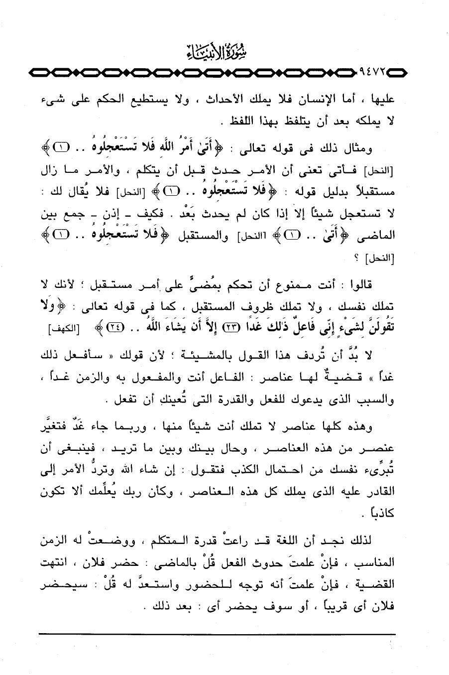 ومثال ذلك في قوله تعالى: {أتى أَمْرُ الله فَلاَ تَسْتَعْجِلُوهُ ... } [النحل: 1] فلا يُقال لك: لا تستعجل شيئاً إلا إذا كان لم يحدث بَعْد: فكيف - إذن - جمع بين الماضي {أتى ... } [النحل: 1] والمستقبل {فَلاَ تَسْتَعْجِلُوهُ. .} [النحل: 1] .