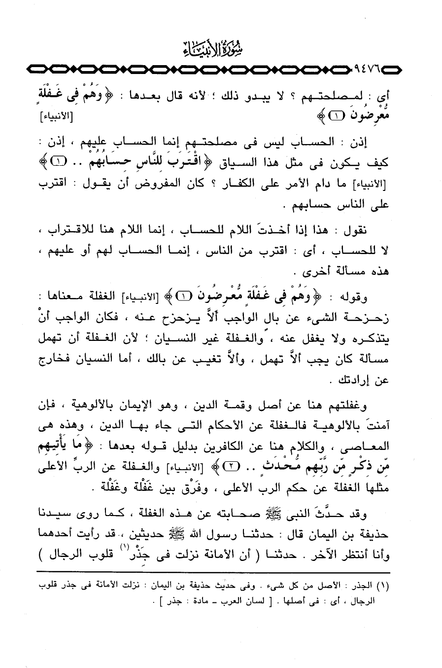 وقوله: {وَهُمْ فِي غَفْلَةٍ مُّعْرِضُونَ} [الأنبياء: 1] الغفلة معناها: زحزحة الشيء عن بال الواجب أَلاَّ يزحزح عنه، فكان الواجب أنْ يتذكره ولا يغفل عنه، والغفلة غير النسيان؛ لأن الغفلة أن تهمل مسألة كان يجب ألاَّ تهمل، وألاَّ تغيب عن بالك، أما النسيان فخارج عن إرادتك.