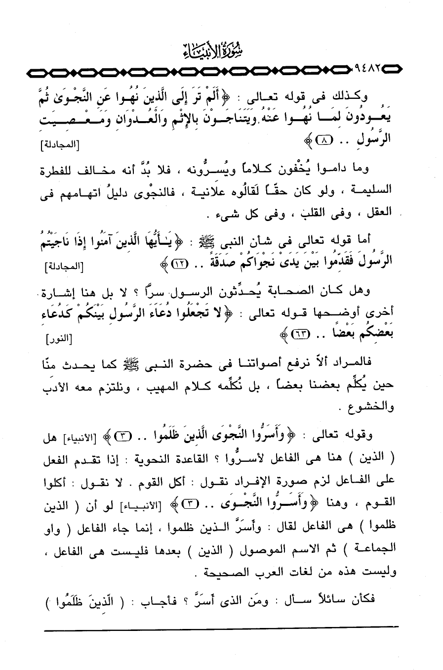 وهل كان الصحابة يُحدِّثون الرسول سرَّاً؟ لا بل هنا إشارة أخرى أوضحها قوله تعالى: {لاَّ تَجْعَلُواْ دُعَآءَ الرسول بَيْنَكُمْ كَدُعَآءِ بَعْضِكُمْ بَعْضاً ... } [النور: 63] .