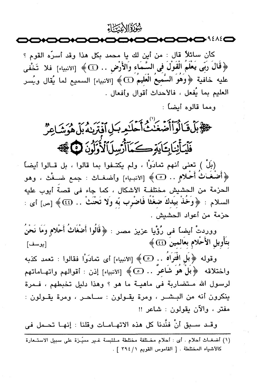 (بَلْ) تعني أنهم تمادَوْا، ولم يكتفو بما قالوا، بل قالوا أيضاً {أَضْغَاثُ أَحْلاَمٍ} [الأنبياء: 5] وأضغاث: جمع ضِغْث، وهو الحزمة من الحشيش مختلفة الأشكال، كما جاء في قصة أيوب عليه السلام: {وَخُذْ بِيَدِكَ ضِغْثاً فاضرب بِّهِ وَلاَ تَحْنَثْ ... } [ص: 44] أي حزمة من أعواد الحشيش.