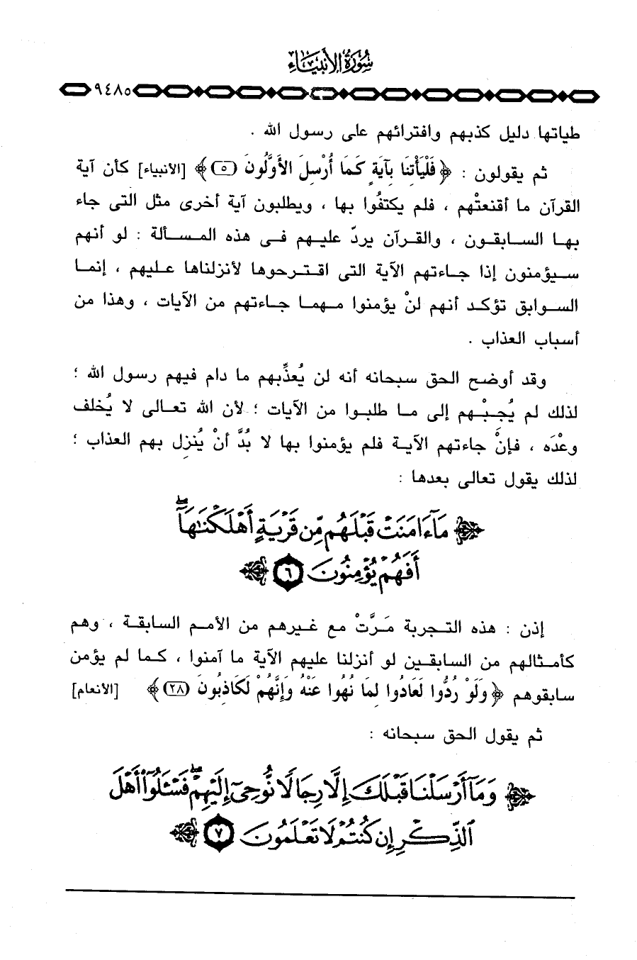 وقد أوضح الحق سبحانه أنه لن يُعذَّبهم ما دام فيهم رسول الله؛ لذلك لم يُجِبْهم إلى ما طلبوا من الآيات؛ لأن الله تعالى لا يُخلف وعْدَه، فإنْ جاءتهم الآية فلم يؤمنوا بها لا بُدَّ أنْ يُنزِل بهم العذاب؛ لذلك يقول تعالى بعدها: {مَآ آمَنَتْ قَبْلَهُمْ ... } .