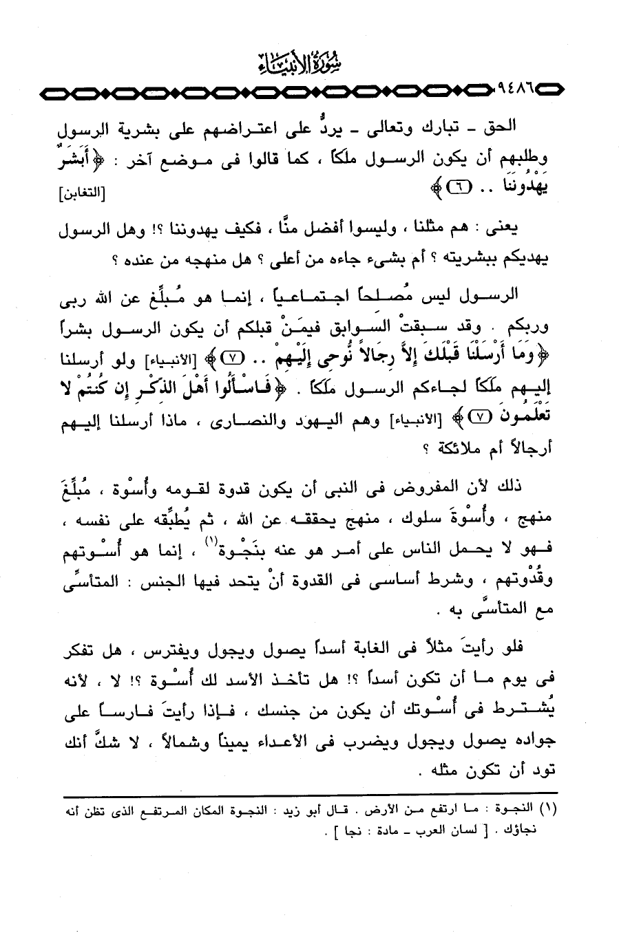 فلو رأيت مثلاً في الغابة أسداً يصول ويجول ويفترس، هل تفكر في يوم ما أن تكون أسداً؟ هل تأخذ الأسد لك أُسْوة؟} لا، لأنه يُشترط في أُسْوتك أن يكون من جنسك، فإذا رأيتَ فارساً على جواده يصول ويجول ويضرب في الأعداد يميناً وشمالاً، لا شكَّ أنك تود أن تكون مثله.