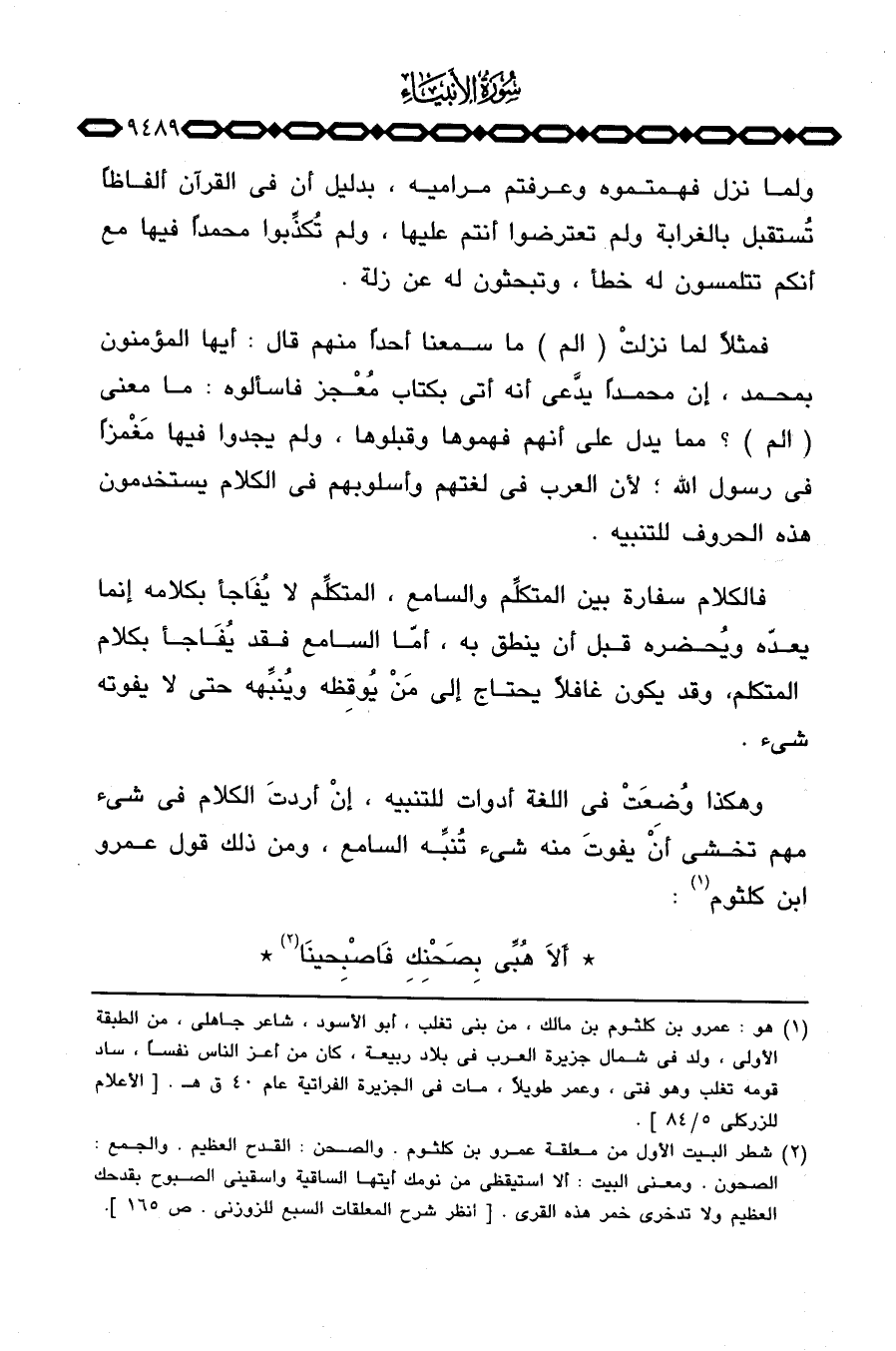 وهكذا وُضِعَتْ في اللغة أدوات للتنبيه، إنْ أردتَ الكلام في شيء مهم تخشى أنْ يفوتَ منه شيء تُنبِّه السامع، ومن ذلك قول عمرو ابن كلثوم: