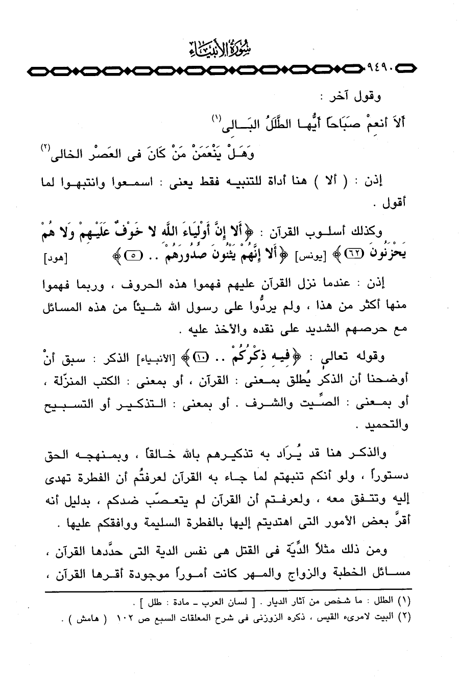 أَلاَ أنعِمْ صَبَاحاً أُيُّها الطَّلَلُ البَالي ... وَهَلْ يَنْعَمَنْ مَنْ كَانَ في العَصْر الخالي