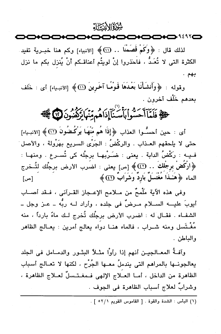 وفي هذه الآية مَلْمحٌ من ملامح الإعجاز القرآني، فقد أصاب أيوبَ عليه السلام مرضٌ في جلده، وأراد له ربُّه - عَزَّ وَجَلَّ - الشفاء. فقال له: اضرب الأرض برِجْلك تُخرج لك ماءً بارداً، منه مُغْتَسل ومنه شراب، فالماء هنا دواء يعالج أمرين: يعالج الظاهر والباطن.