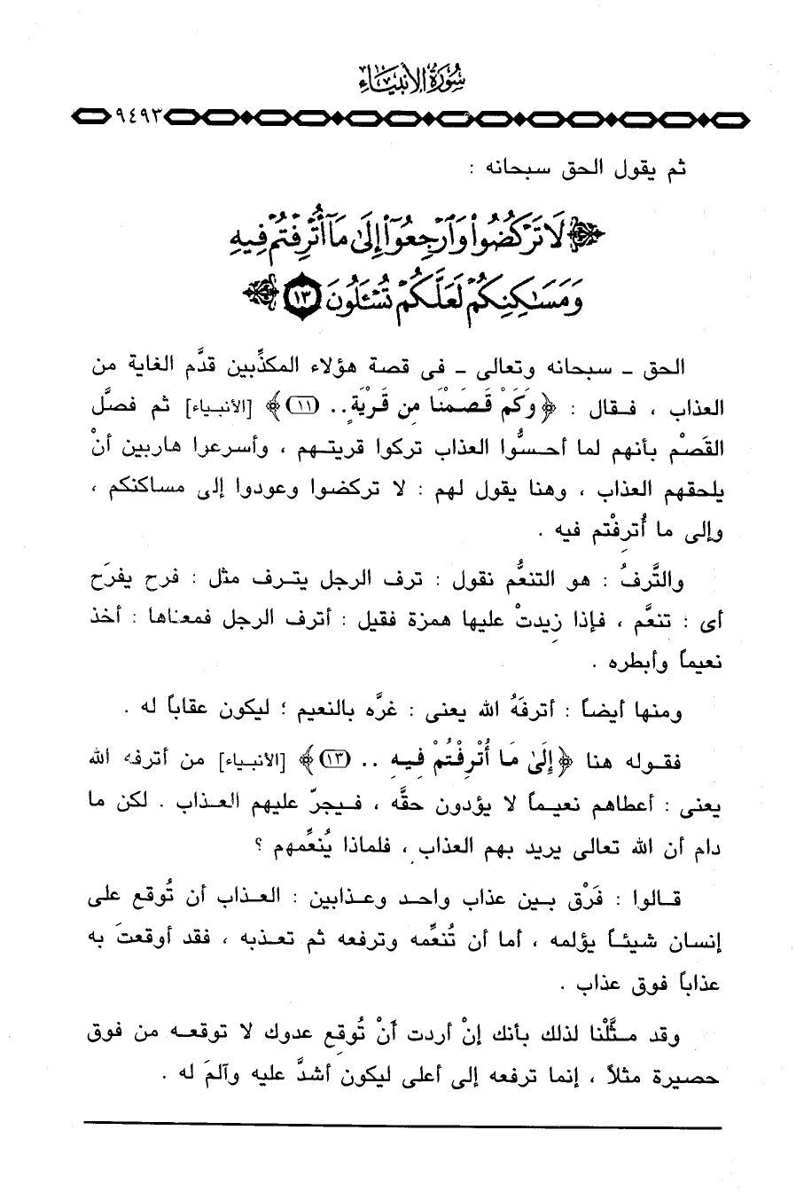 فقوله هنا {إلى مَآ أُتْرِفْتُمْ فِيهِ. .} [الأنبياء: 13] من أترافه الله يعني: أعطاهم نعيماً لا يؤدون حقَّه، فيجرّ عليهم العذاب. لكن ما دام أن الله تعالى يريد بهم العذاب، فلماذا يُنعِّمهم؟
