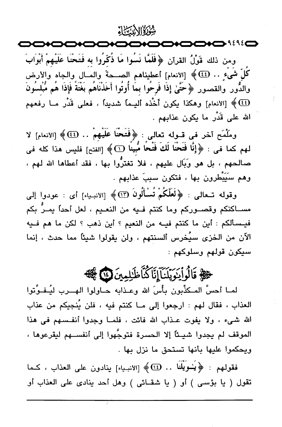 ومن ذلك قَوْلُ القرآن {فَلَمَّا نَسُواْ مَا ذُكِّرُواْ بِهِ فَتَحْنَا عَلَيْهِمْ أَبْوَابَ كُلِّ شَيْءٍ ... } [الأنعام: 44] أعطيناهم الصحة والمال والجاه والأرض والدُّور والقصور {حتى إِذَا فَرِحُواْ بِمَآ أوتوا أَخَذْنَاهُمْ بَغْتَةً فَإِذَا هُمْ مُّبْلِسُونَ} [الأنعام: 44] وهكذا يكون أَخذْه أليماً شديداً، فعلى قَدْر ما رفعهم الله على قَدْر ما يكون عذابهم.