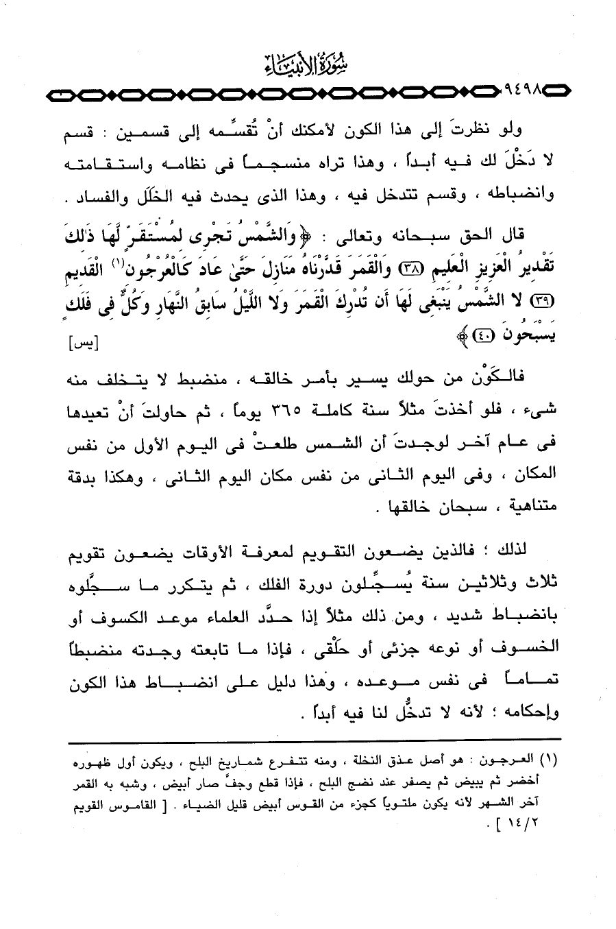قال الحق سبحانه وتعالى: {والشمس تَجْرِي لِمُسْتَقَرٍّ لَّهَا ذَلِكَ تَقْدِيرُ العزيز العليم والقمر قَدَّرْنَاهُ مَنَازِلَ حتى عَادَ كالعرجون القديم لاَ الشمس يَنبَغِي لَهَآ أَن تدْرِكَ القمر وَلاَ الليل سَابِقُ النهار وَكُلٌّ فِي فَلَكٍ يَسْبَحُونَ} [يس: 38 - 40] .