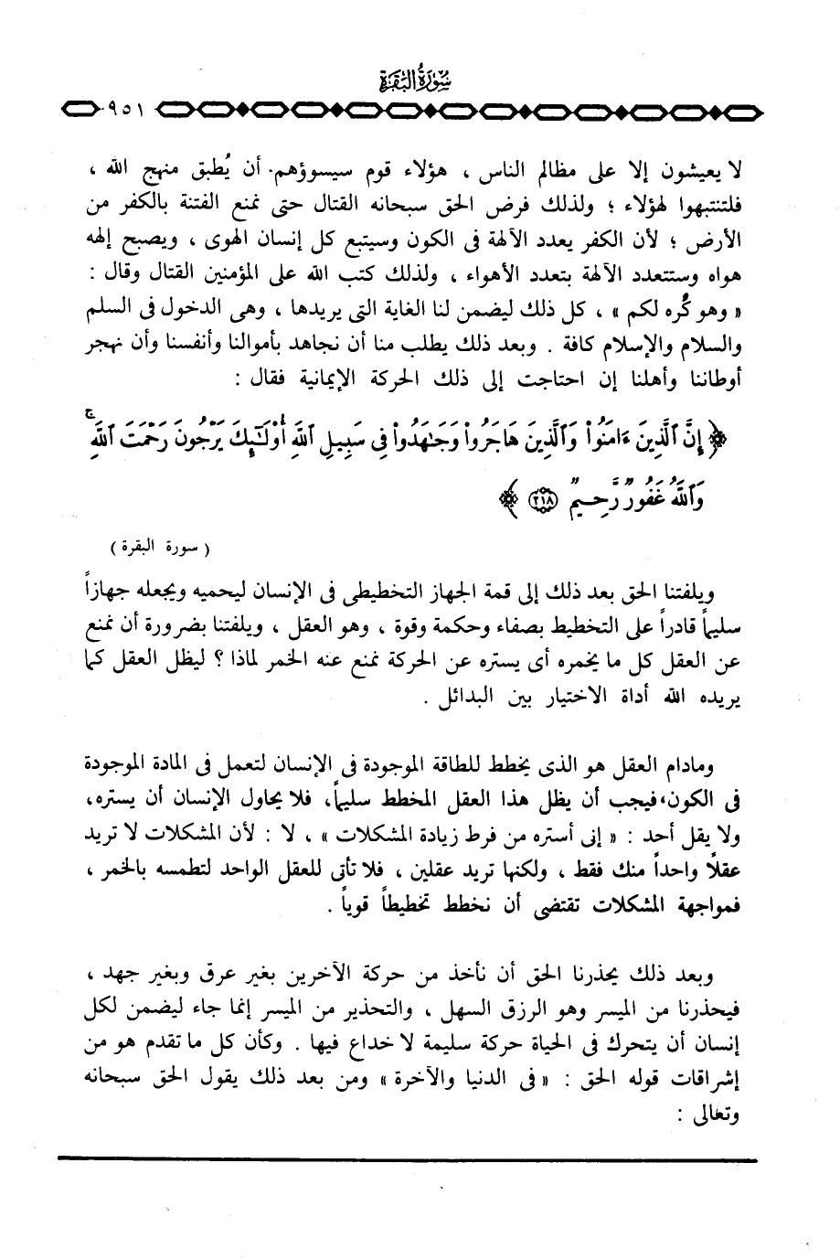وما دام العقل هو الذي يخطط للطاقة الموجودة في الإنسان لتعمل في المادة الموجودة في الكون فيجب أن يظل هذا العقل المخطط سليماً، فلا يحاول الإنسان أن يستره، ولا يقل أحد: «إني أستره من فرط زيادة المشكلات» ، لا: لأن المشكلات لا تريد عقلاً واحداً منك فقط، ولكنها تريد عقلين، فلا تأتي للعقل الواحد لتطمسه بالخمر، فمواجهة المشكلات تقتضي أن نخطط تخطيطاً قوياً.