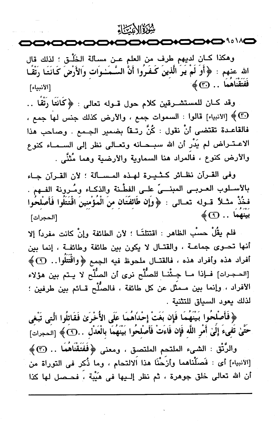وقد كان للمستشرقين كلام حول قوله تعالى: {كَانَتَا رَتْقاً} [الأنبياء: 30] قالوا: السماوات جمع، والأرض كذلك جنس لها جمع، فالقاعدة تقتضي أنْ نقول: كُنَّ رتقاً بضمير الجمع. وصاحب هذا الاعتراض لم يَدْر أن الله سبحانه وتعالى نظر إلى السماء كنوع والأرض كنوع، فالمراد هنا السماوةي والأرضية وهما مُثنَّى.