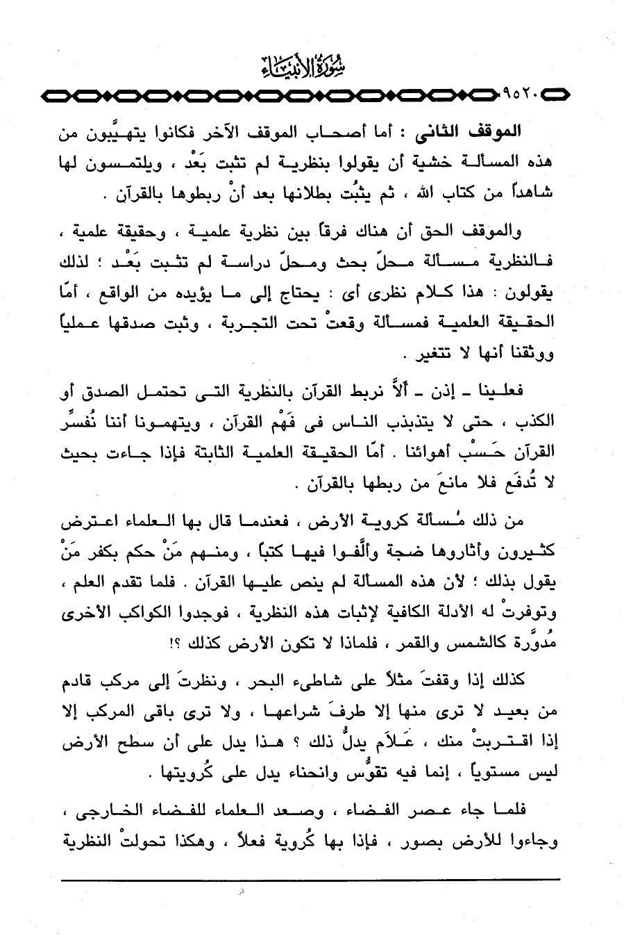 من ذلك مسألة كروية الأرض، فعندما قال بها العلماء اعترض كثيرون وأثاروها ضجة وألَّفوا فيها كتباً، ومنهم مَنْ حكم بكفر مَنْ يقول بذلك؛ لأن هذه المسألة لم ينص عليها القرآن. فلما تقدم العلم، وتوفرتْ له الأدلة الكافية لإثبات هذه النظرية، فوجدوا الكواكب الأخرى مُدوَّرة كالشمس والقمر، فلماذا لا تكون الأرض كذلك؟!