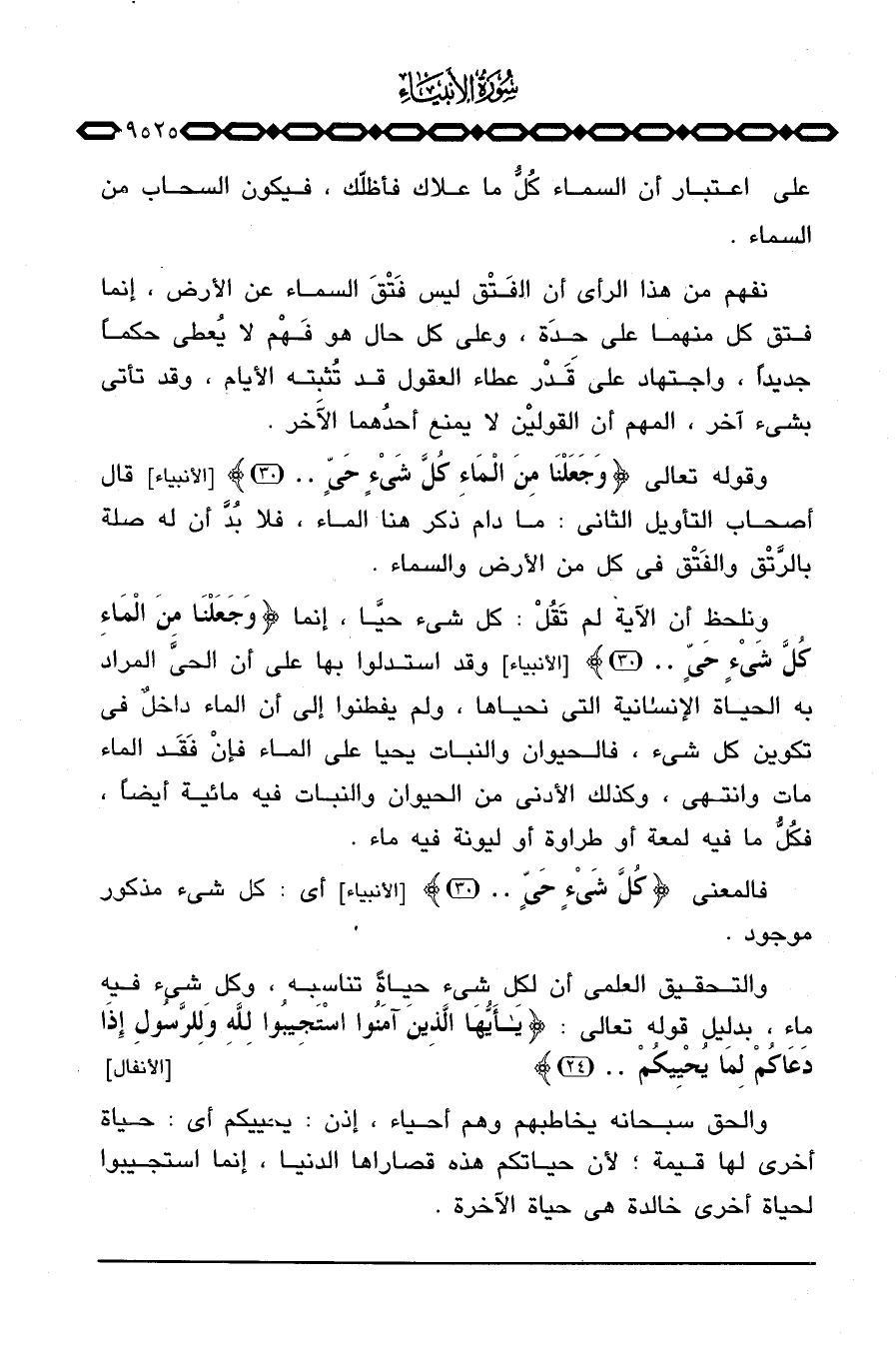 ونلحظ أن الآية لم تَقُلْ: كل شيء حيَّا، إنما {وَجَعَلْنَا مِنَ المآء كُلَّ شَيْءٍ حَيٍّ ... } [الأنبياء: 30] وقد استدلوا بها على أن الحيَّ المراد به الحياة الإنسانية التي نحياها، ولم يفطنوا إلى أن الماء داخلٌ في تكوين كل شيء، فالحيوان والنبات يحيا على الماء فإنْ فَقَد الماء مات وانتهى، وكذلك الأدنى من الحيوان والنبات فيه مائية أيضاً، فكُلُّ ما فيه لمعة أو طراوة أو ليونة فيه ماء.