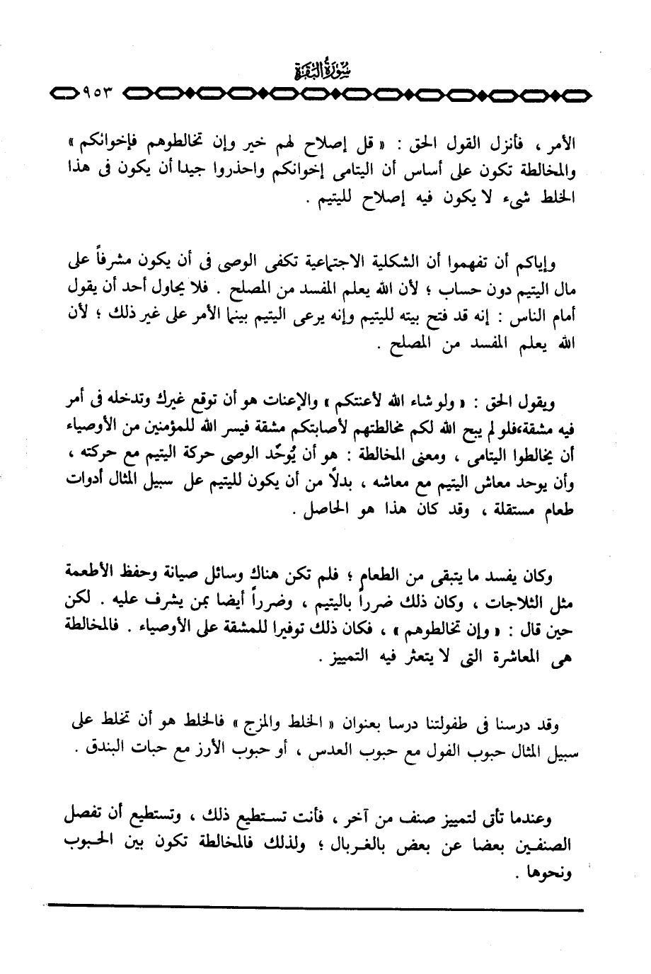 الأمر، فأنزل القول الحق: {قُلْ إِصْلاَحٌ لَّهُمْ خَيْرٌ وَإِنْ تُخَالِطُوهُمْ فَإِخْوَانُكُمْ} والمخالطة تكون على أساس أن اليتامى إخوانكم واحذروا جيداً أن يكون في هذا الخلط شيء لا يكون فيه إصلاح لليتيم.