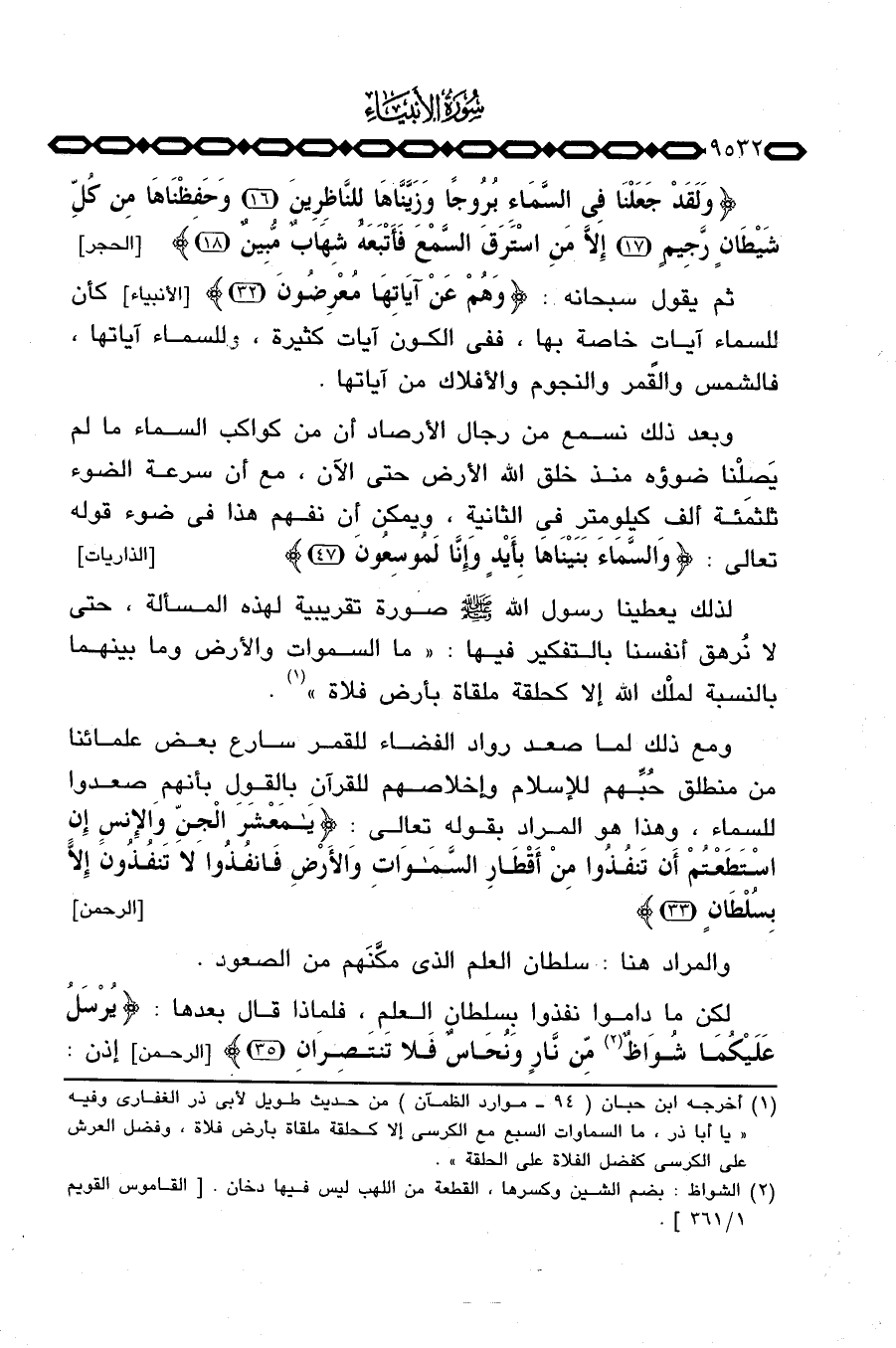 وبعد ذلك نسمع من رجال الأرصاد أن من كواكب السماء ما لم يَصِلْنا ضوؤه منذ خلق الله الأرض حتى الآن، مع أن سرعة الضوء ثلثمئة ألف كيلومتر في الثانية، ويمكن أن نفهم هذا في ضوء قوله تعالى: {والسمآء بَنَيْنَاهَا بِأَييْدٍ وَإِنَّا لَمُوسِعُونَ} [الذاريات: 47] .