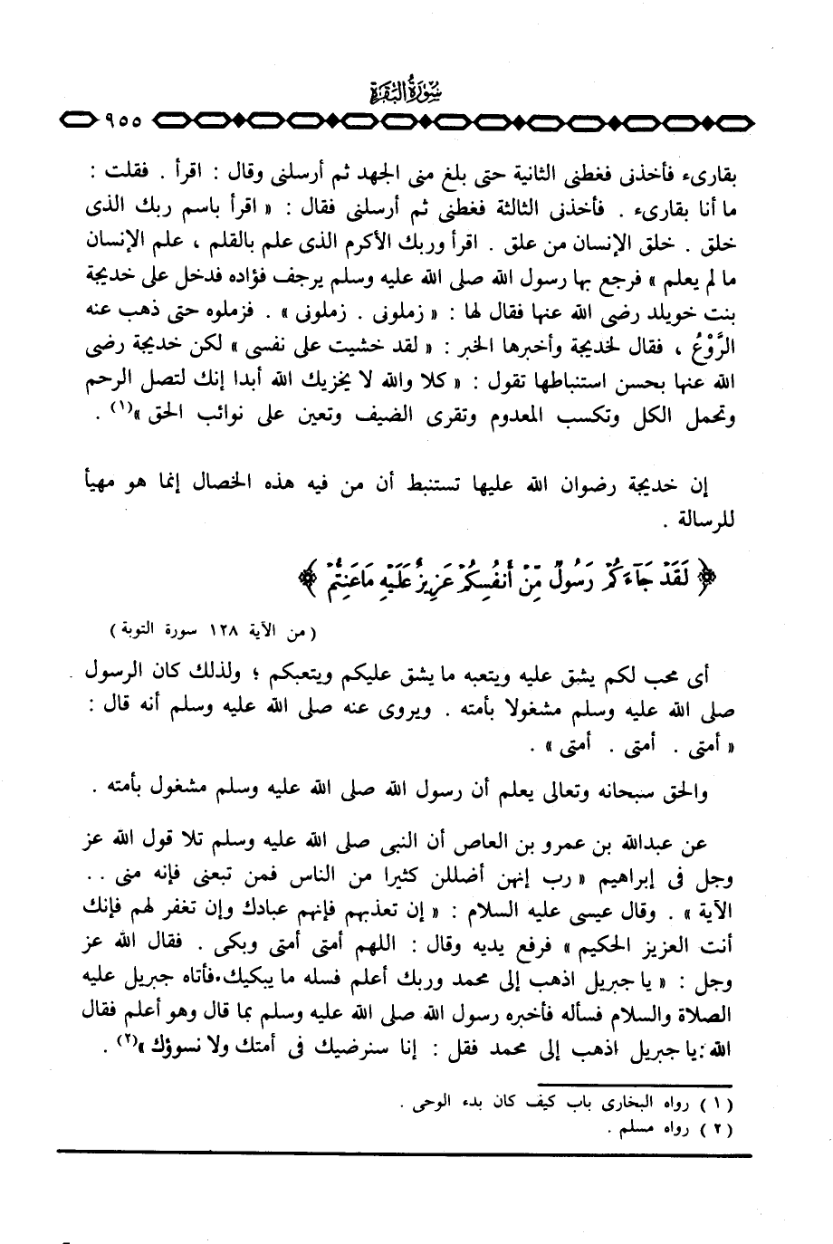 بقارئ فأخذني فغطني الثانية حتى بلغ مني الجهد ثم أرسلني وقال: اقرأ. فقلت: ما أنا بقارئ. فأخذني الثالثة فغطني ثم أرسلني فقال: {اقرأ باسم رَبِّكَ الذي خَلَقَ خَلَقَ الإنسان مِنْ عَلَقٍ اقرأ وَرَبُّكَ الأكرم الذى عَلَّمَ بالقلم عَلَّمَ الإنسان مَا لَمْ يَعْلَمْ} فرجع بها رسول الله صَلَّى اللَّهُ عَلَيْهِ وَسَلَّم َ يرجف فؤاده فدخل على خديجة بنت خويلد رَضِيَ اللَّهُ عَنْها فقال لها:» زملوني. زملوني «. فزملوه حتى ذهب عنه الروع، فقال لخديجة وأخبرها الخبر:» لقد خشيت على نفسي «لكن خديجة رَضِيَ اللَّهُ عَنْها بحسن استنباطها تقول:» كلا والله لا يخزيك الله أبدا إنك لتصل الرحم وتحمل الكل وتكسب المعدوم وتقري الضيف وتعين على نوائب الحق «» .