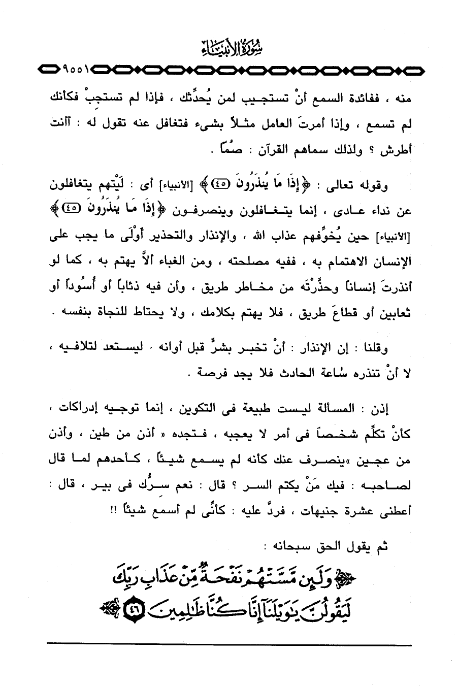 وقوله تعالى: {إِذَا مَا يُنذَرُونَ} [الأنبياء: 45] أي: لَيْتهم يتغافلون عن نداء عادي، إنما يتغافلون وينصرفون {إِذَا مَا يُنذَرُونَ} [الأنبياء: 45] حين يُخوِّفهم عذاب الله، والإنذار والتحذير أَوْلَى ما يجب على الإنسان الاهتمام به، ففيه مصلحته، ومن الغباء ألاَّ يهتم به، كما لو أنذرتَ إنساناً وحذَّرْتَه من مخاطر طريق، وأن فيه ذئاباً أو أُسُوداً أو ثعابين أو قطاعَ طريق، فلا يهتم بكلامك، ولا يحتاط للنجاة بنفسه.