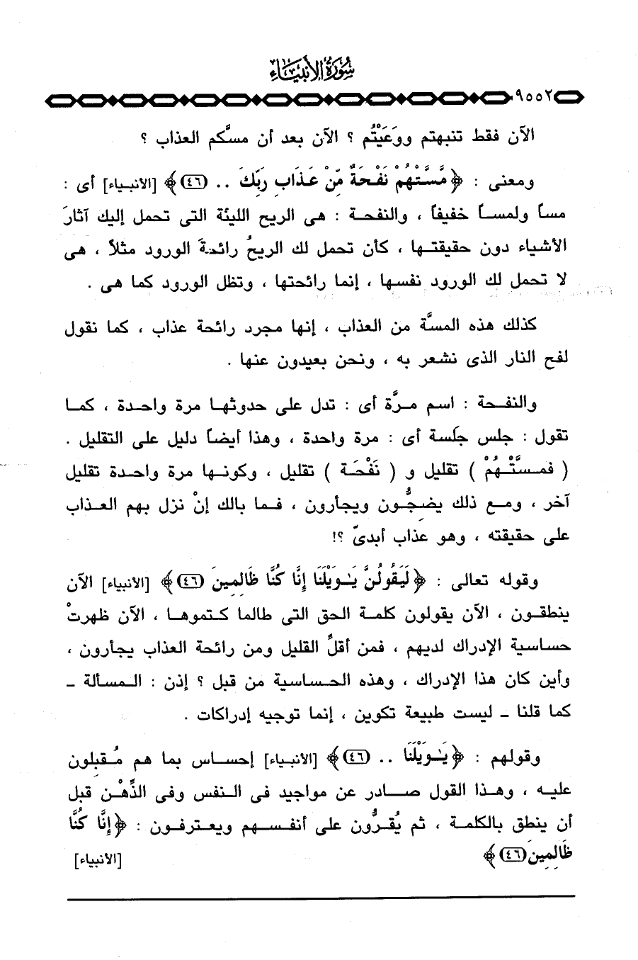 وقوله تعالى: {لَيَقُولُنَّ ياويلنآ إِنَّا كُنَّا ظَالِمِينَ} [الأنبياء: 46] الآن ينطقون، الآن يقولون كلمة الحق التي طالما كتموها، الآن ظهرتْ حساسية الإدراك لديهم، فمن أقلِّ القليل ومن رائحة العذاب يجأؤون، وأين كان هذا الإدراك، وهذه الحساسية من قبل؟ إذن: المسألة - كما قلنا - ليست طبيعة تكوين، إنما توجيه إدراكات.
