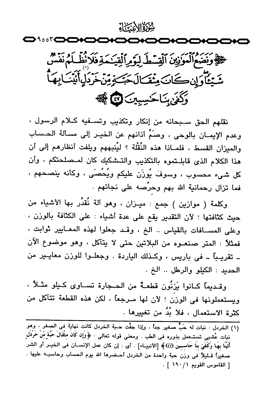 وكلمة (موازين) جمع: ميزان، وهو آلة نُقدِّر بها الأشياء من حيث كثافتها، لأن التقدير يقع على عدة أشياء: على الكثافة بالوزن، وعلى المسافات بالقياس. . الخ، وقد جعلوا لهذه المعايير ثوابت، فمثلاً: المتر صنعوه من البلاتين حتى لا يتآكل، وهو موضوع الآن - تقريباً - في باريس، وكذلك الياردة. وجعلوا للوزن معايير من الحديد: الكيلو والرطل. . إلخ.