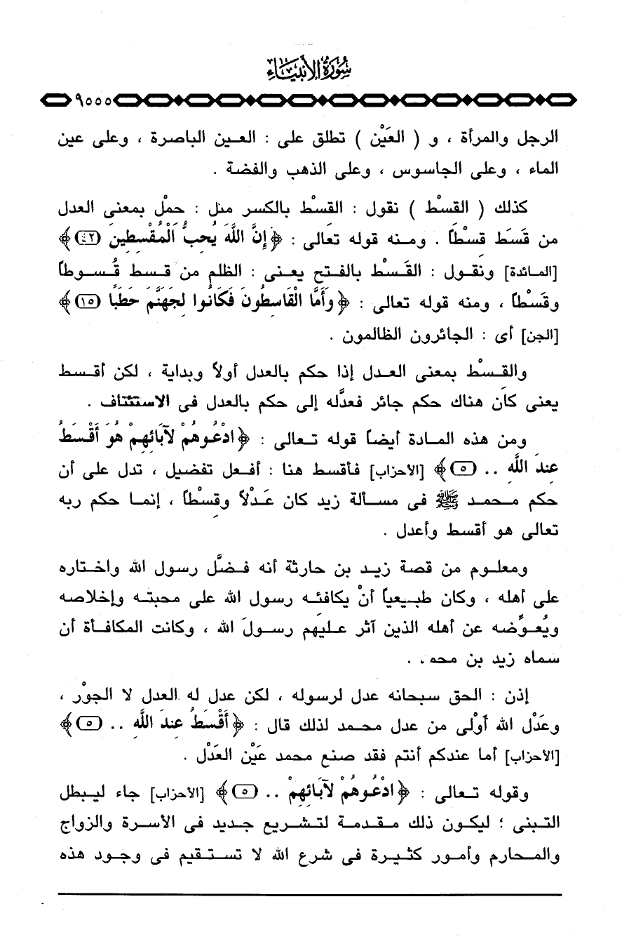 ومن هذه المادة أيضاً قوله تعالى: {ادعوهم لآبَآئِهِمْ هُوَ أَقْسَطُ عِندَ الله ... } [الأحزاب: 5] فأقسط هنا: أفعل تفضيل، تدل على أن حكم محمد صَلَّى اللَّهُ عَلَيْهِ وَسَلَّم َ في مسألة زيد كان عَدْلاً وقِسْطاً، إنما حكم ربه تعالى هو أقسط وأعدل.