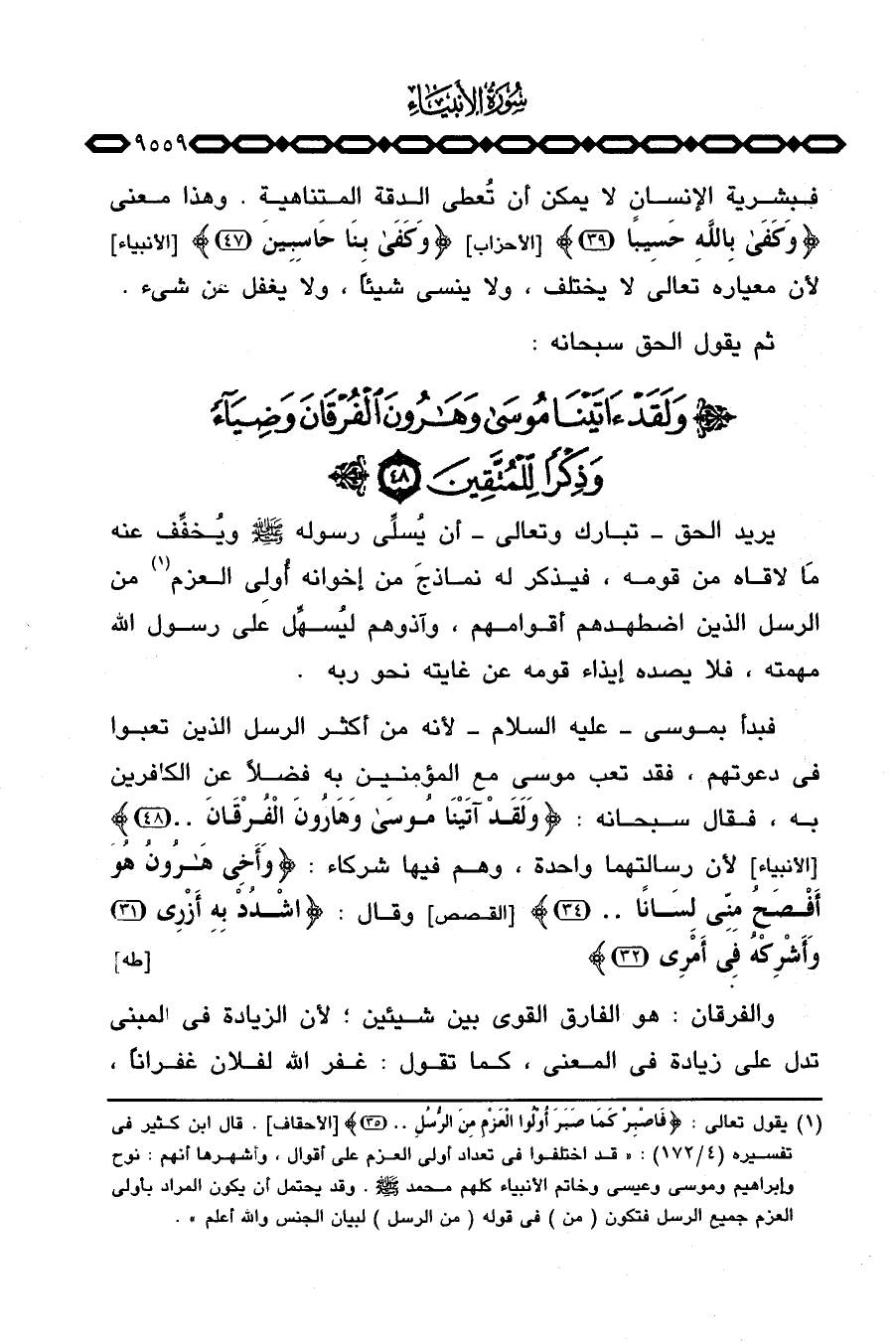 فبدأ بموسى - عليه السلام - لأنه من أكثر الرسل الذين تعبوا في دعوتهم، فقد تعب موسى مع المؤمنين به فضلاً عن الكافرين به، فقال سبحانه: {وَلَقَدْ آتَيْنَا موسى وَهَارُونَ الفرقان ... } [الأنبياء: 48] لأن رسالتهما واحدة، وهم فيها شركاء: {وَأَخِي هَارُونُ هُوَ أَفْصَحُ مِنِّي لِسَاناً ... } [القصص: 34] وقال: {اشدد بِهِ أَزْرِي وَأَشْرِكْهُ في أَمْرِي} [طه: 31 - 32] .
