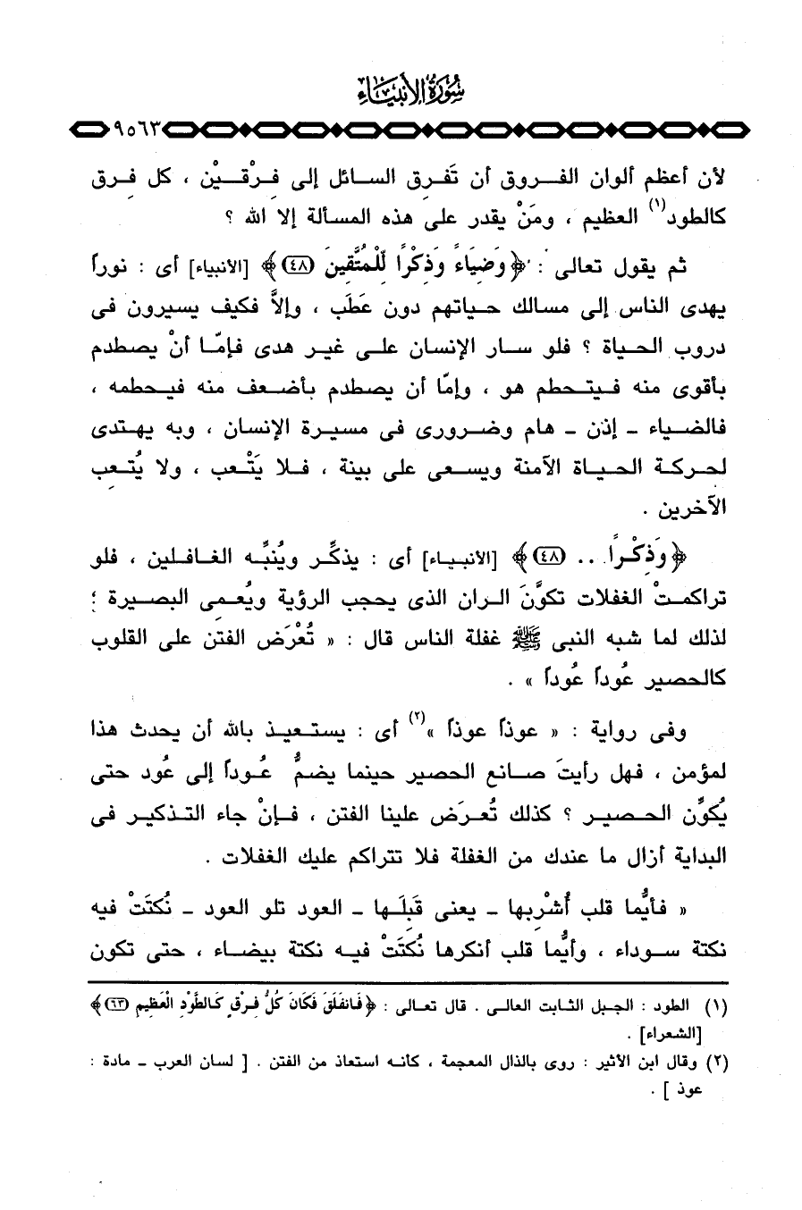 {وَذِكْراً ... } [الأنبياء: 48] أي: يذكِّر ويُنبِّه الغافلين، فلو تراكمتْ الغفلات تكوَّنَ الران الذي يحجب الرؤية ويُعمى البصيرة، لذلك لما شبه النبي صَلَّى اللَّهُ عَلَيْهِ وَسَلَّم َ غفلة الناس قال: «تُعْرَض الفتن على القلوب كالحصير عُوداً عُوداً» .