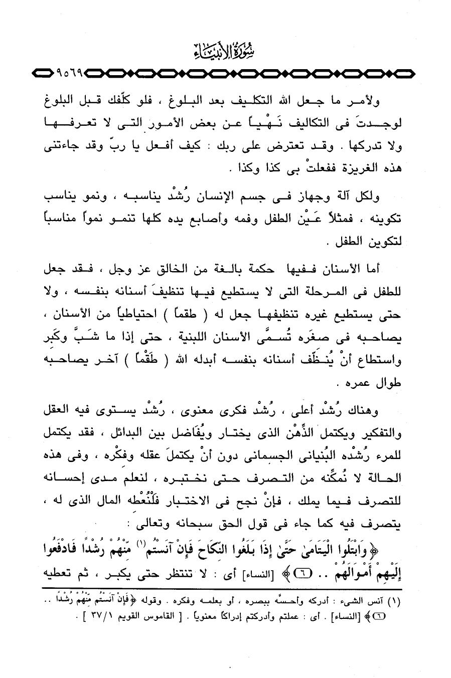 ولكل آلة وجهاز في جسم الإنسان رُشْد يناسبه، ونمو يناسب تكوينه، فمثلاً عَيْن الطفل وفمه وأصابع يده كلها تنمو نمواً مناسباً لتكوين الطفل.