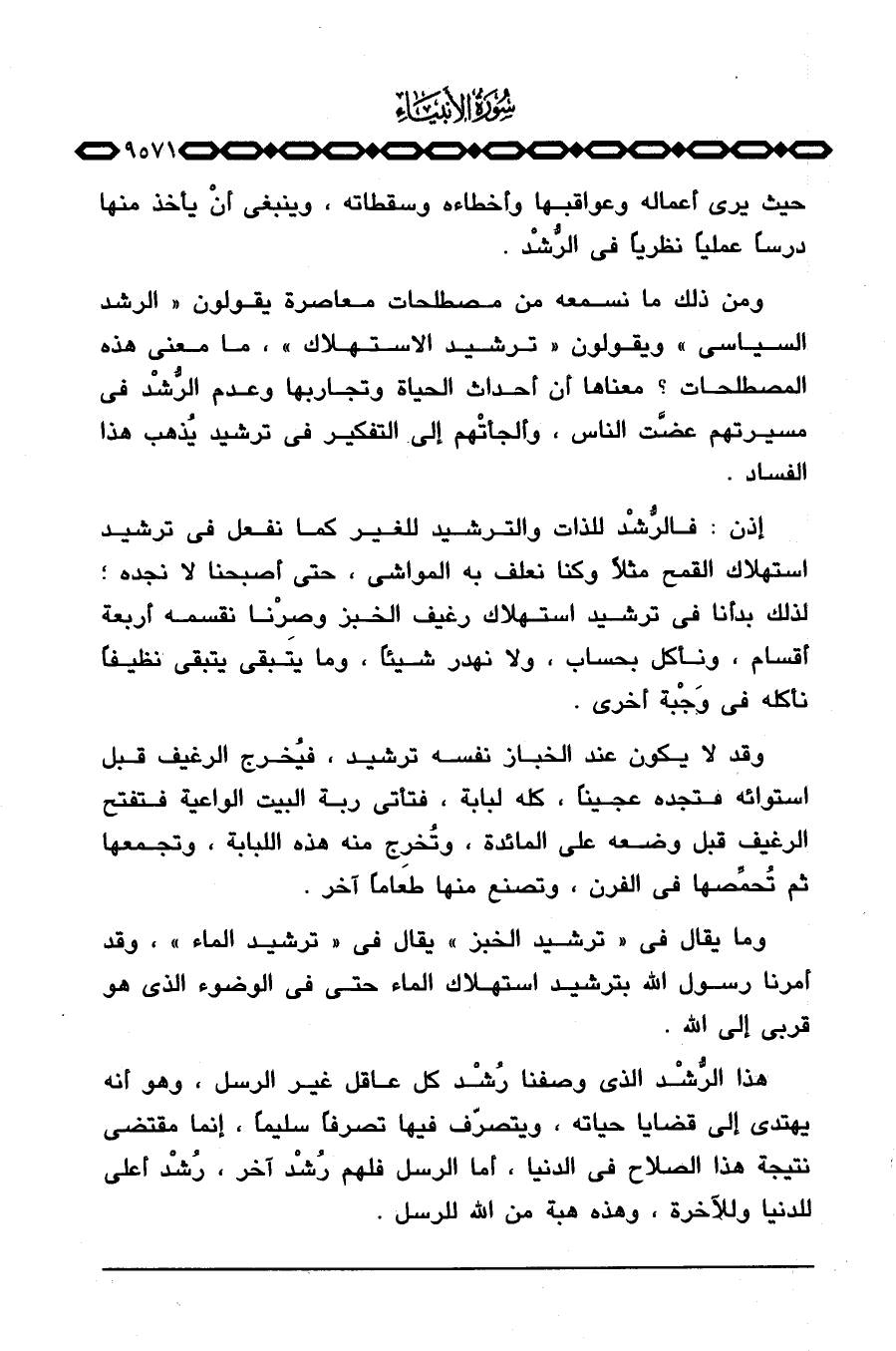 وما يقال في «ترشيد الخبز» يقال في «ترشيد الماء» ، وقد أمرنا رسول الله بترشيد استهلاك الماء حتى في الوضوء الذي هو قربي إلى الله.