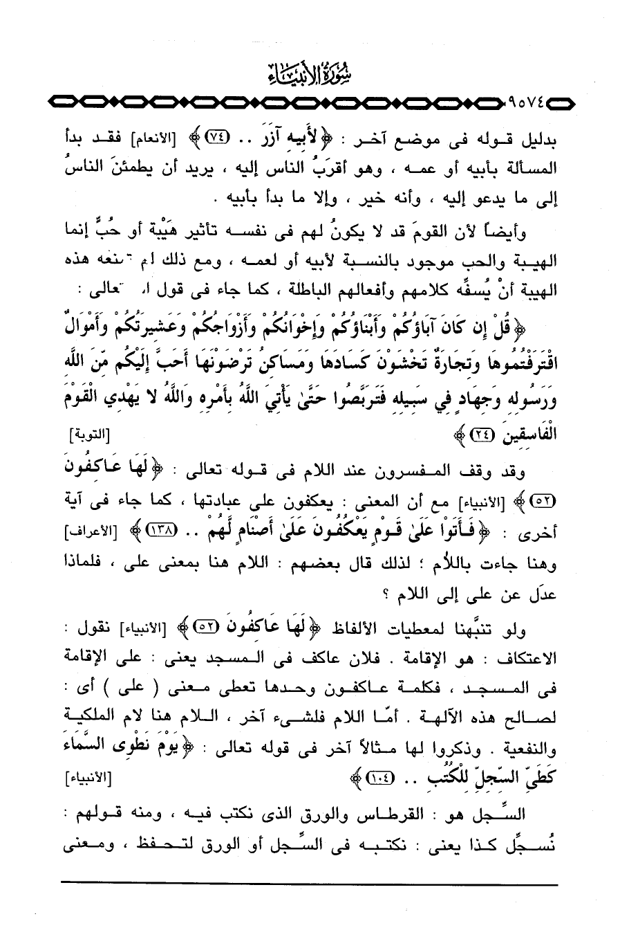 ولو تنبَّهنا لمعطيات الألفاظ {لَهَا عَاكِفُونَ} [الأنبياء: 52] نقول: الاعتكاف: هو الإقامة. فلان عاكف في المسجد يعني: على الإقامة في المسجد، فكلمة عاكفون وحدها تعطي معنى (على) أي: لصالح هذه الآلهة. أمّا اللام فلشيء آخر، اللام هنا لام الملكية والنفعية. وذكروا لها مثالاً آخر في قوله تعالى: {يَوْمَ نَطْوِي السمآء كَطَيِّ السجل لِلْكُتُبِ ... } [الأنبياء: 104] .