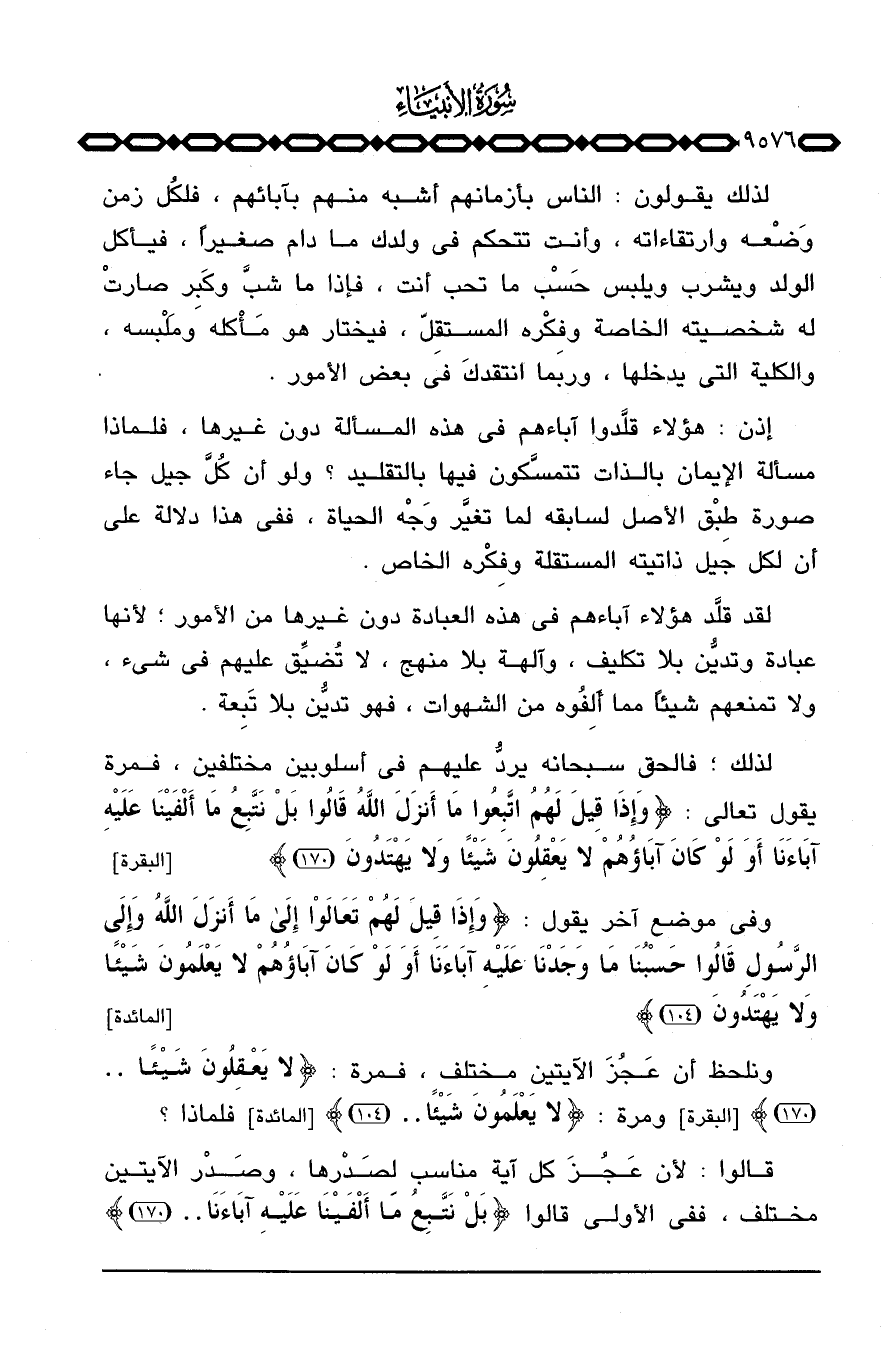 وفي موضع آخر يقول: {وَإِذَا قِيلَ لَهُمْ تَعَالَوْاْ إلى مَآ أَنزَلَ الله وَإِلَى الرسول قَالُواْ حَسْبُنَا مَا وَجَدْنَا عَلَيْهِ آبَاءَنَآ أَوَلَوْ كَانَ آبَاؤُهُمْ لاَ يَعْلَمُونَ شَيْئاً وَلاَ يَهْتَدُونَ} [المائدة: 104] .