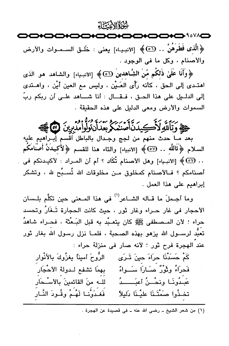 {وَأَنَاْ على ذلكم مِّنَ الشاهدين} [الأنبياء: 56] والشاهد هو الذي اهتدى إلى الحق، كأنه رَأْى العَيْن، وليس مع العين أَيْن، واهتدى إلى الدليل على هذا الحق، فقال: أنا شاهد على أن ربكم ربّ السماوات والأرض ومعي الدليل على هذه الحقيقة. {وتالله لأَكِيدَنَّ ... } .