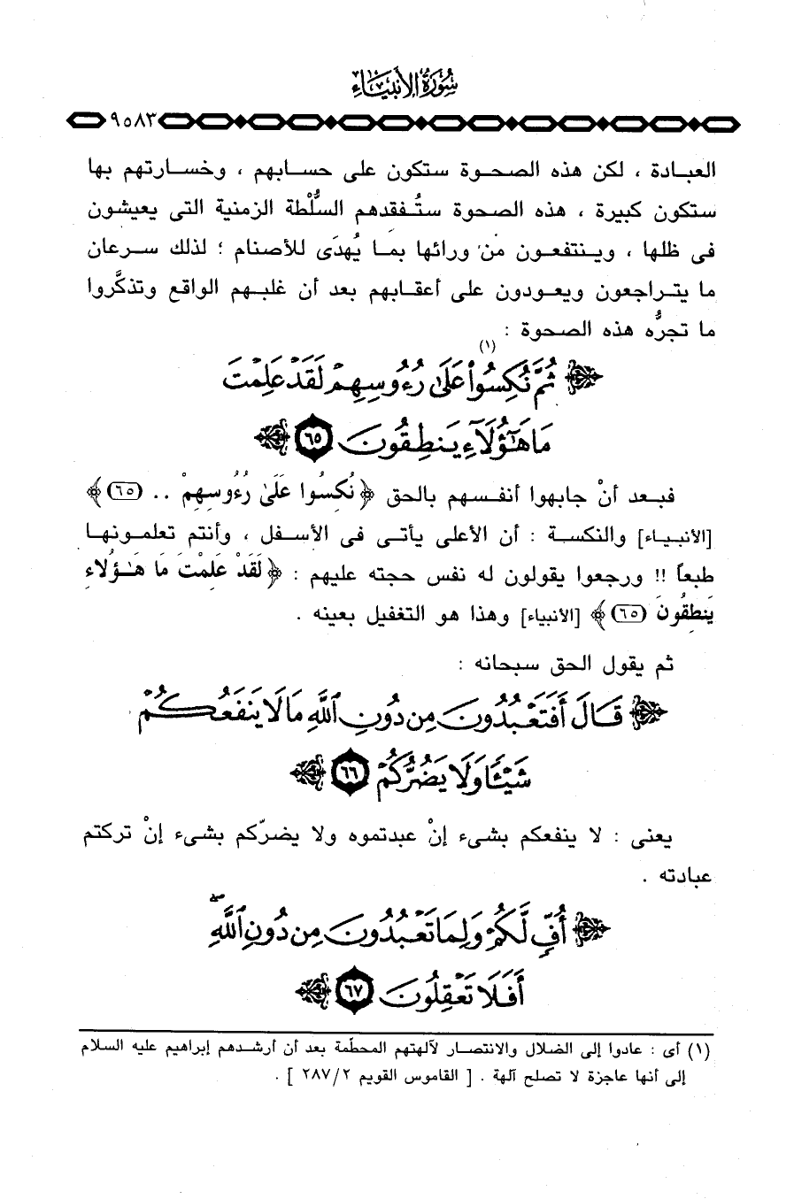 العبادة، لكن هذه الصحوة ستكون على حسابهم، وخسارتهم بها ستكون كبيرة، هذه الصحوة ستُفقِدهم السُّلْطة الزمنية التي يعيشون في ظلها، وينتفعون من ورائها بما يُهدَي للأصنام؛ لذلك سرعان ما يتراجعون ويعودون على أعقابهم بعد أن غلبهم الواقع وتذكَّروا ما تجرُّه هذه الصحوة. {ثُمَّ نُكِسُواْ على رُءُوسِهِمْ ... } .