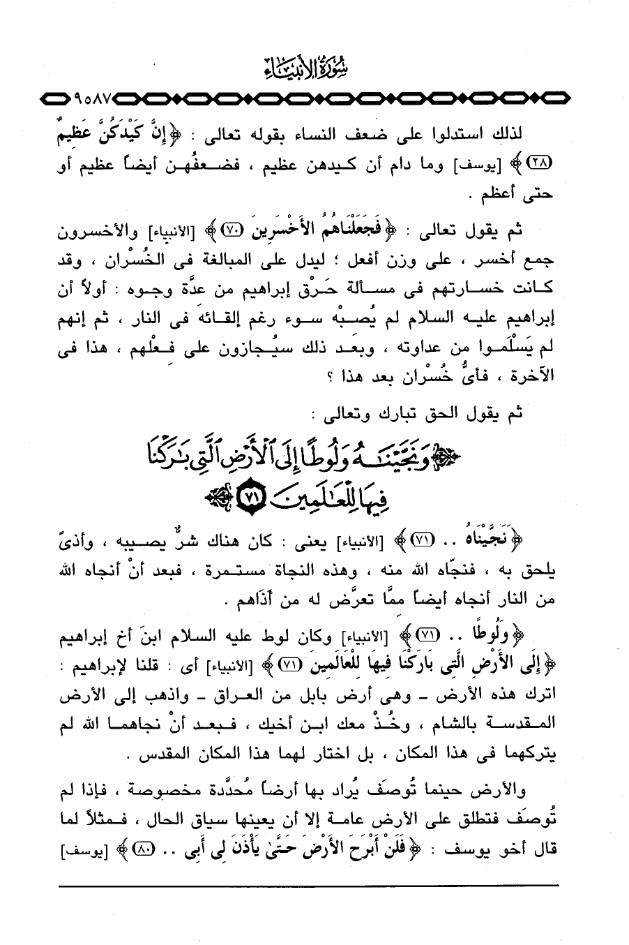 {وَلُوطاً ... } [الأنبياء: 71] وكان لوط عليه السلام ابنَ أخ إبراهيم {إِلَى الأرض التي بَارَكْنَا فِيهَا لِلْعَالَمِينَ} [الأنبياء: 71] أي: قلنا لإبراهيم: اترك هذه الأرض - وهي أرض بابل من العراق - واذهب إلى الأرض المقدسة بالشام، وخُذْ معك ابن أخيك، فبعد أنْ نجاهما الله لم يتركهما في هذا المكان، بل اختار لهما هذا المكان المقدس.
