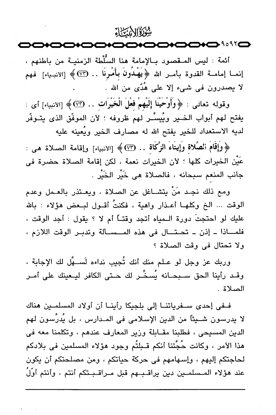 ففي إحدى سفرياتنا إلى بلجيكا رأينا أن أولاد المسلمين هناك لا يدرسون شيئاً من الدين الإسلامي في المدارس، بل يُدرِّسون لهم الدين المسيحي، فطلبنا مقابلة وزير المعارف عندهم، وتكلمنا معه في هذا الأمر، وكانت حُجَّتنا أنكم قبلتُم وجود هؤلاء المسلمين في بلادكم لحاجتكم إليهم، وإسهامهم في حركة حياتكم، ومن مصلحتكم أن يكون عند هؤلاء المسلمين دين يراقبهم قبل مراقبتكم أنتم، وأنتم أوّلُ